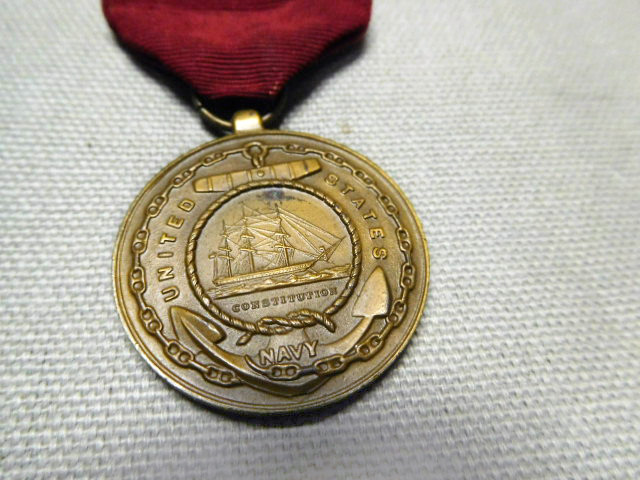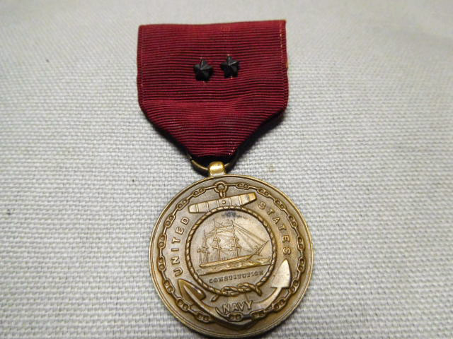 U.S. Navy Good Conduct Medal with 2 stars on ribbon. Vietnam era. Crimped broach.