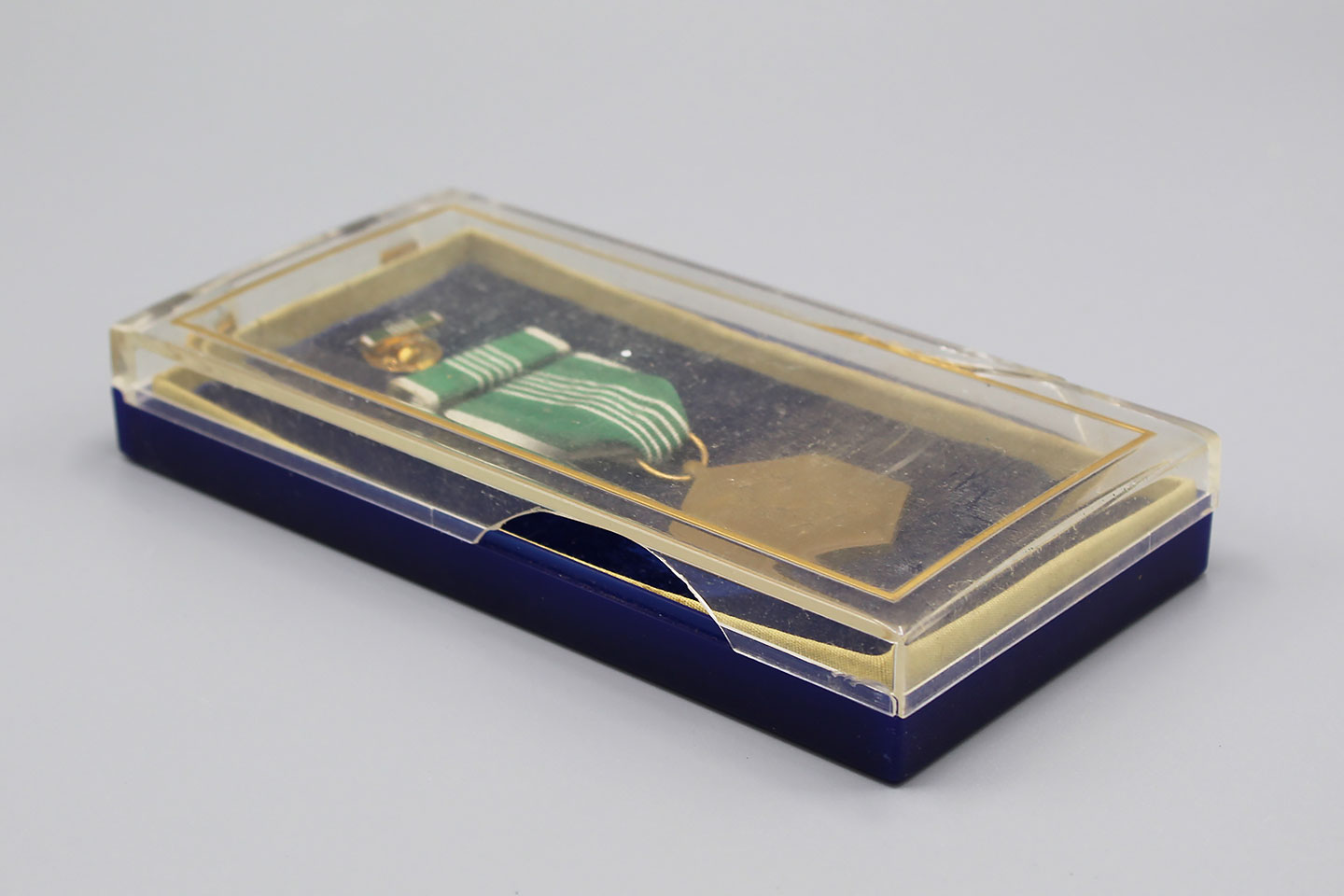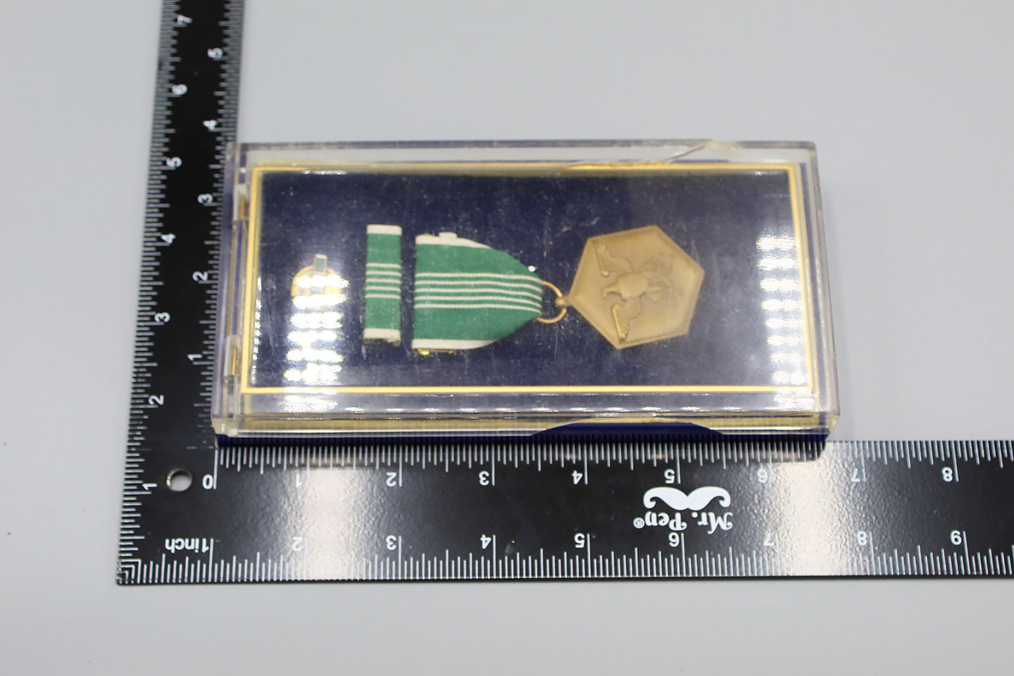 U.S. Army Commendation Medal (Military Merit) with Plastic Clear Case. (Damaged case with damage to edges. Worn and used condition. Most likely 1960s-1970s issue. Crimped broach.
