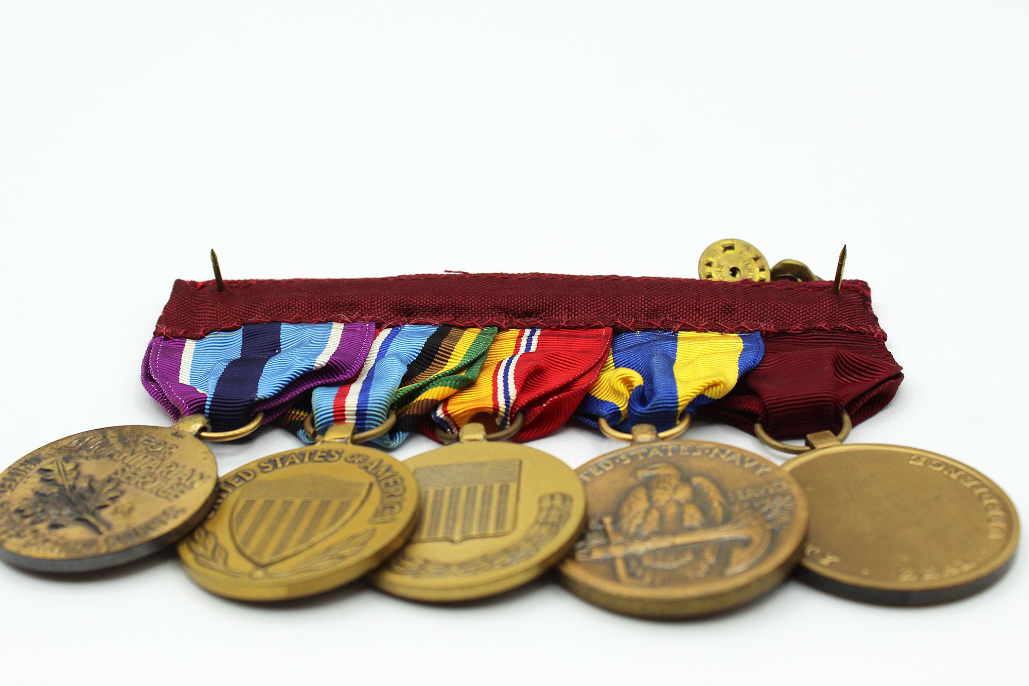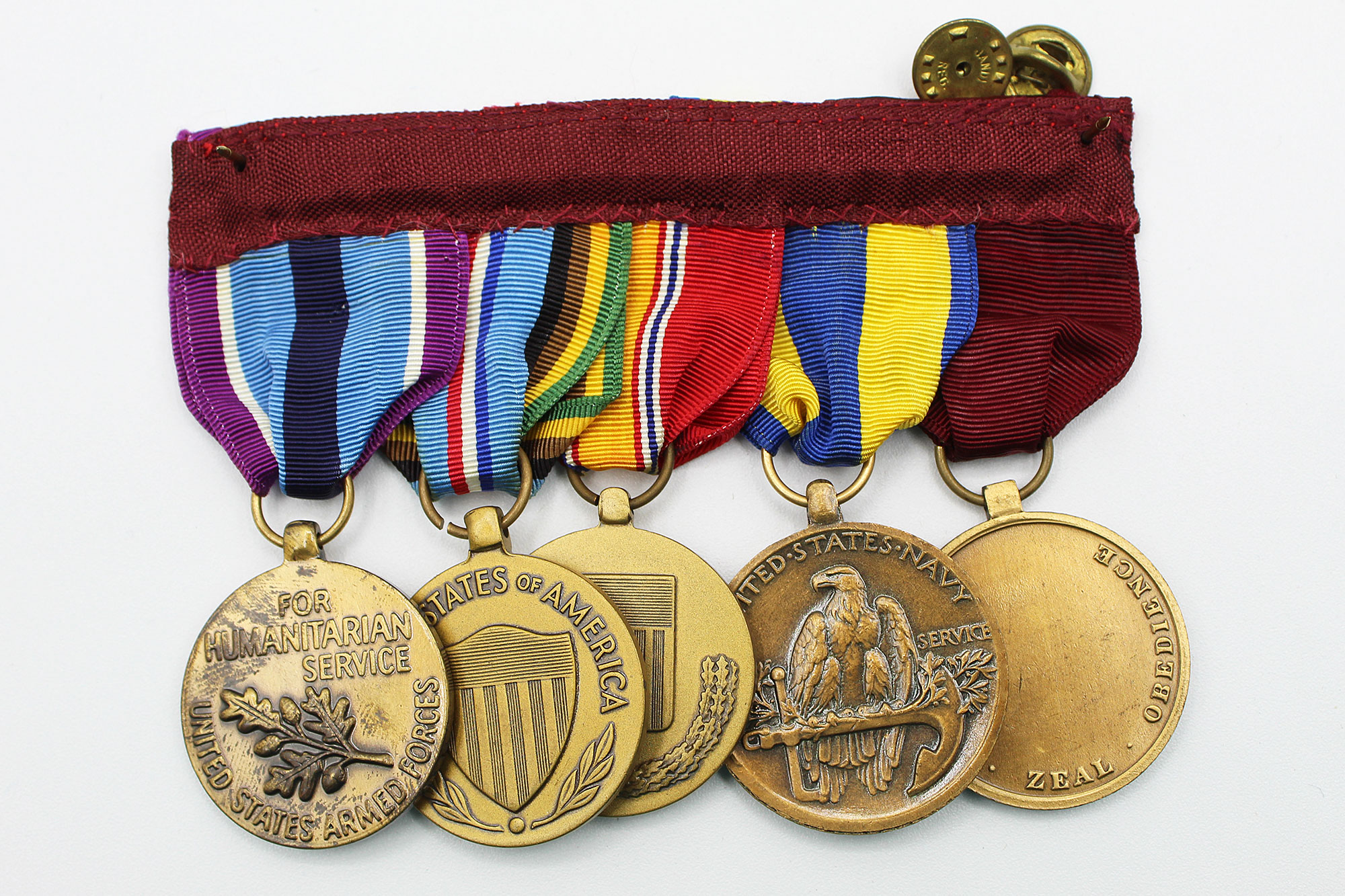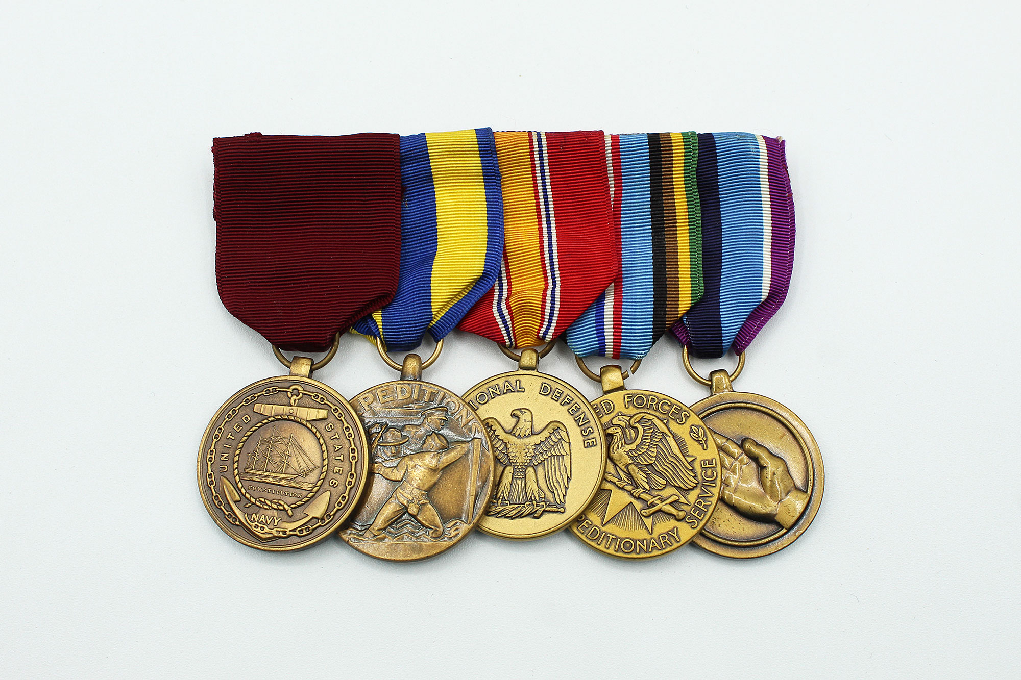 United States Navy Five Place Medal Bar. Clutch back attachment. The medals include: Navy good conduct medal, Navy Expeditionary medal, National Defense Service medal, Armed Forces Expeditionary Service medal, and Armed Forces Humanitarian Service medal. Appears to range from 1960s-1980s era. Worn and used condition.