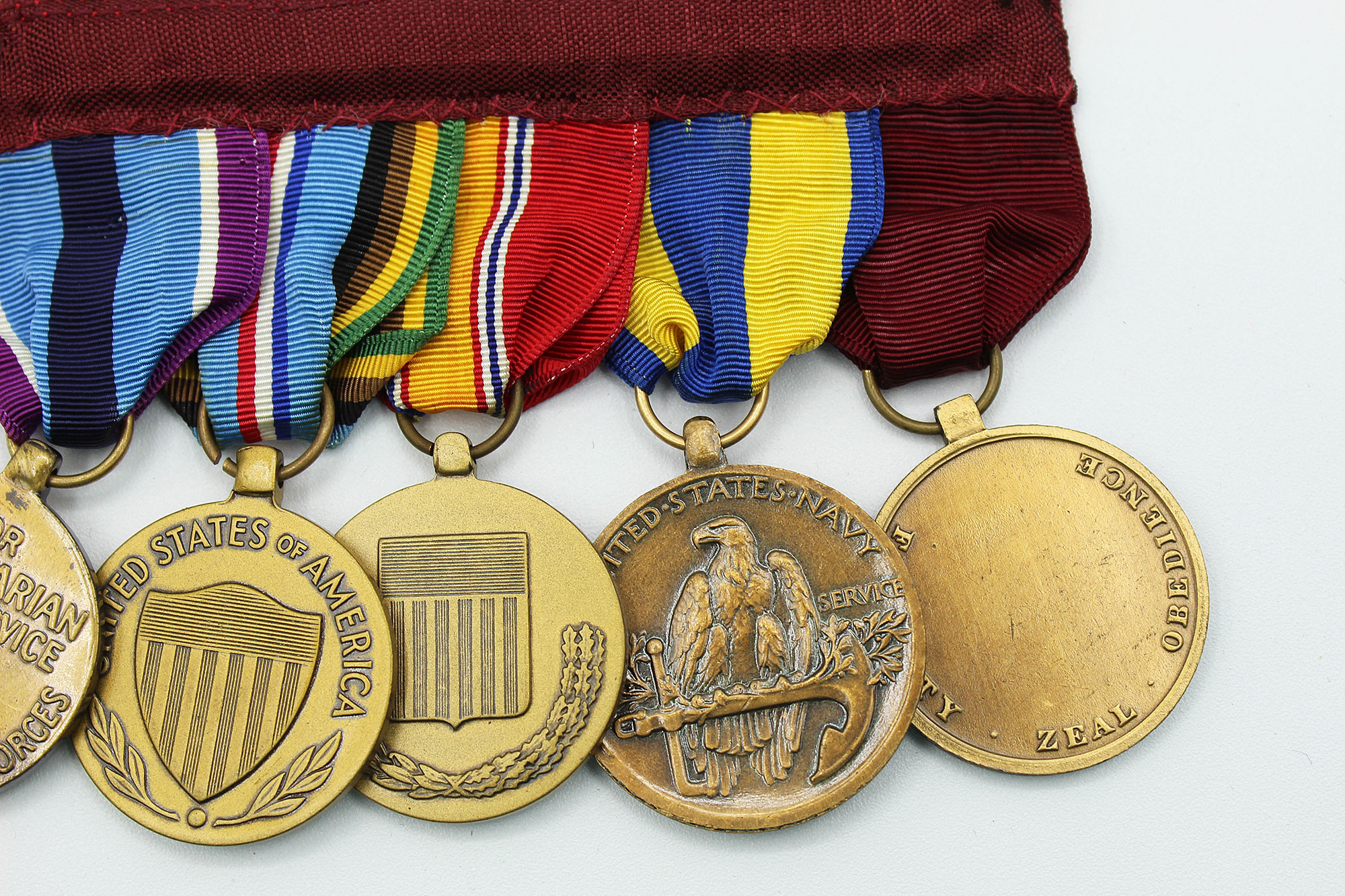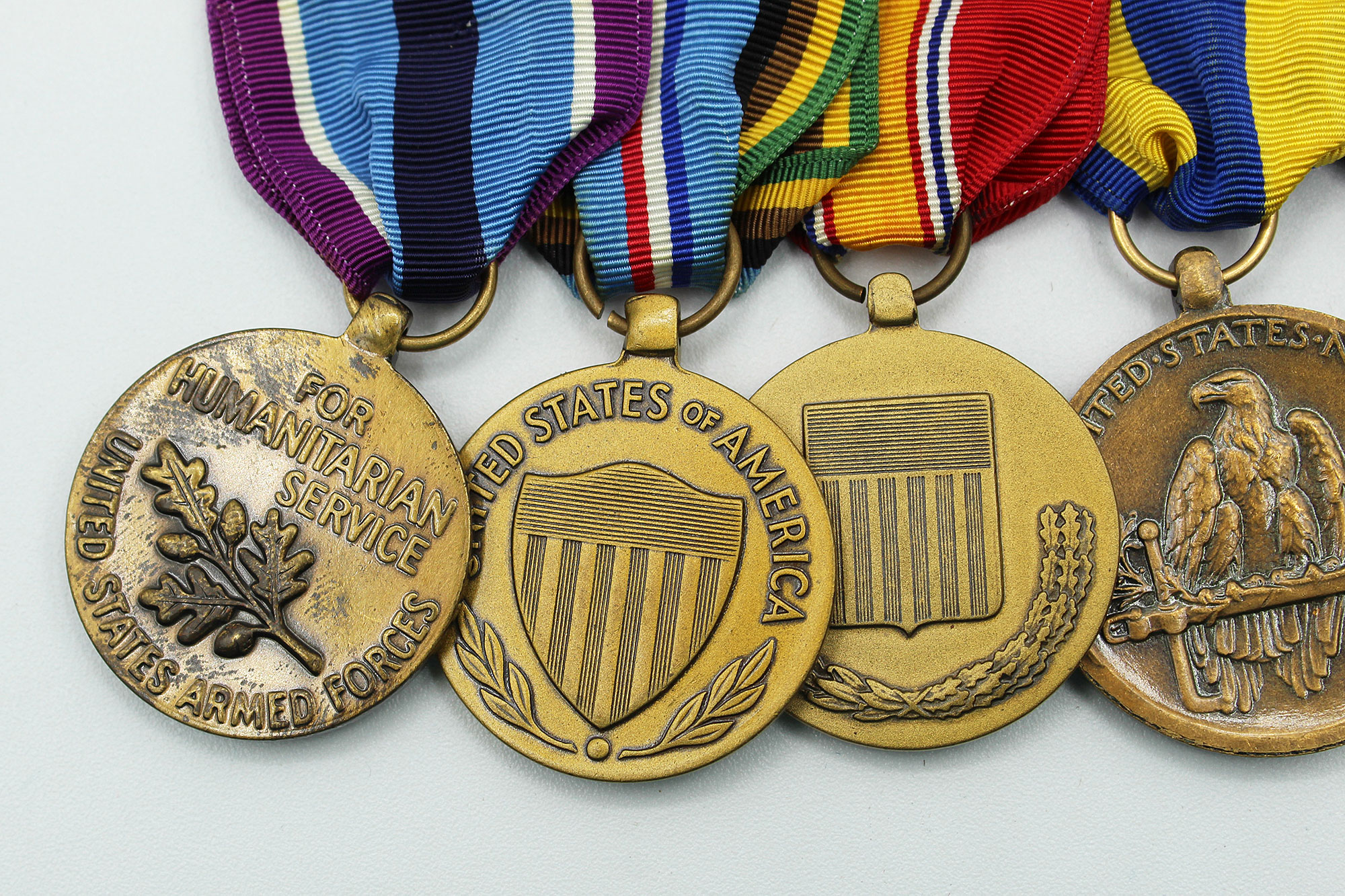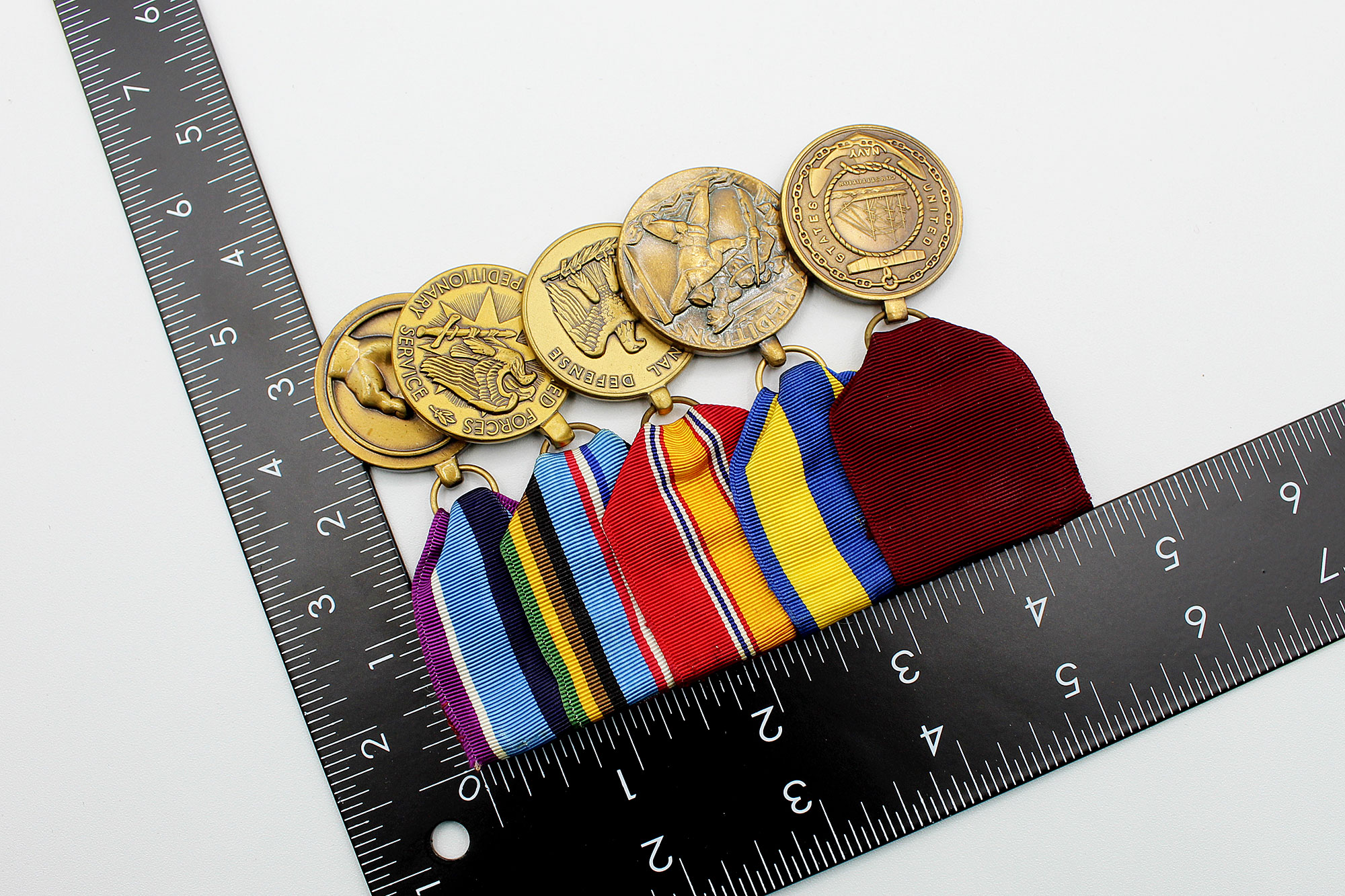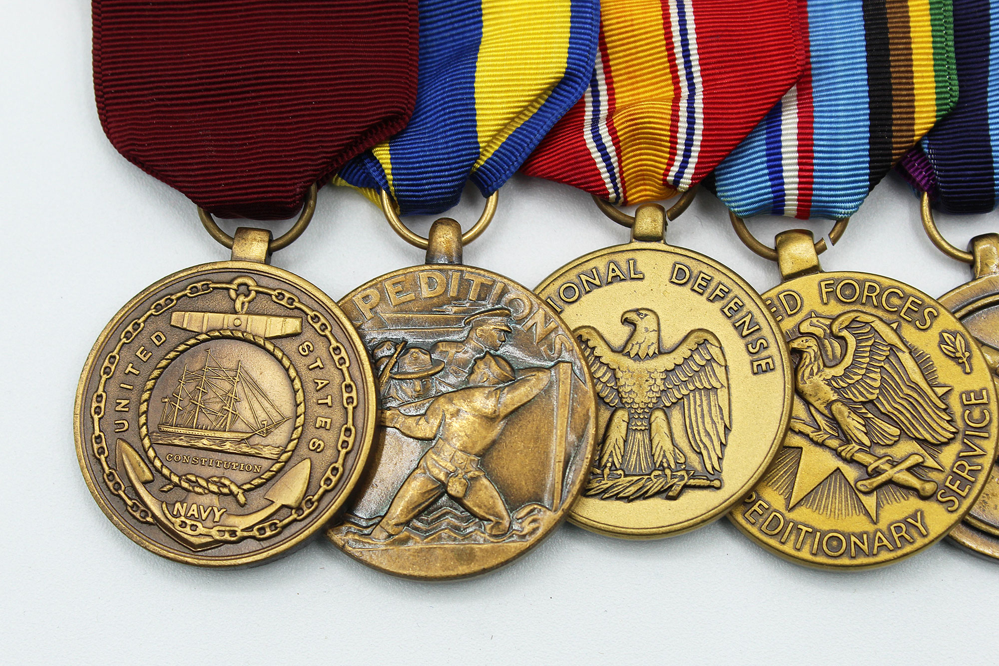 United States Navy Five Place Medal Bar. Clutch back attachment. The medals include: Navy good conduct medal, Navy Expeditionary medal, National Defense Service medal, Armed Forces Expeditionary Service medal, and Armed Forces Humanitarian Service medal. Appears to range from 1960s-1980s era. Worn and used condition.