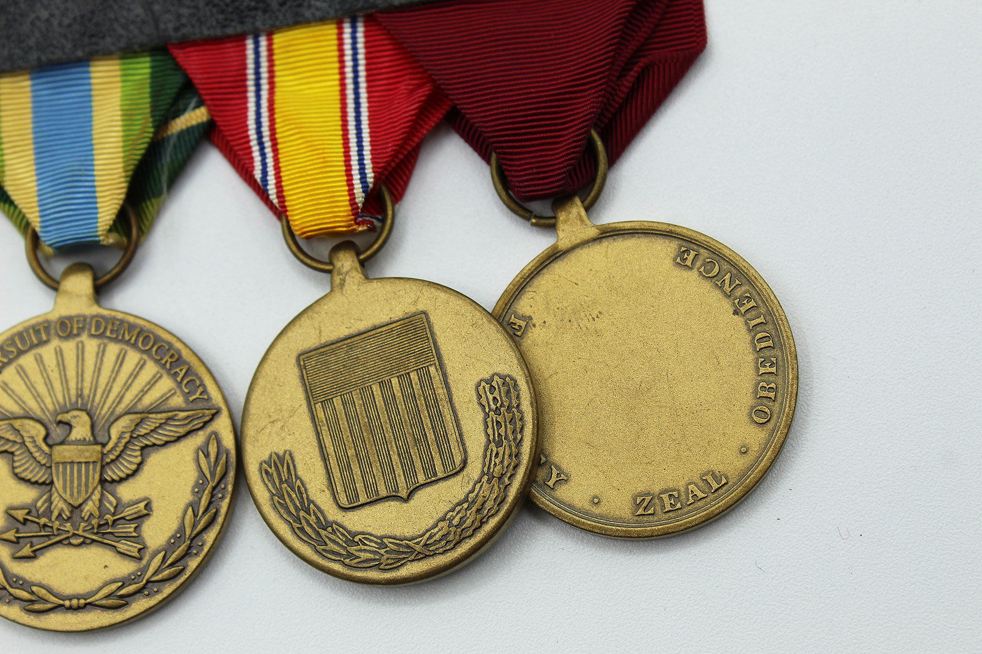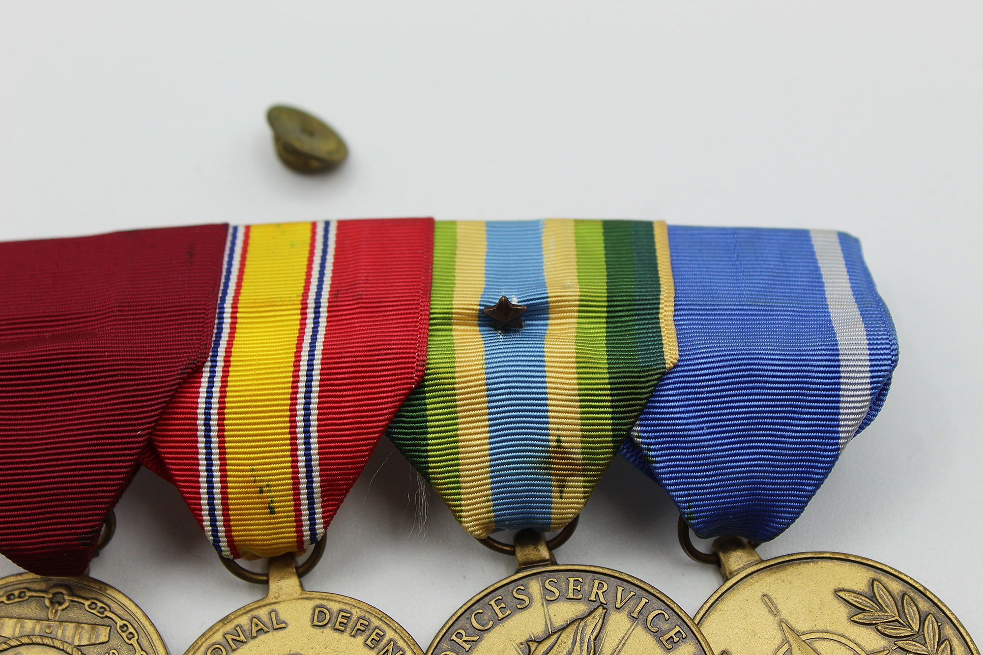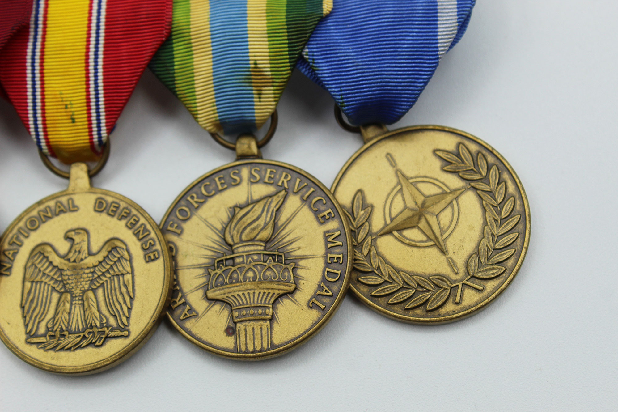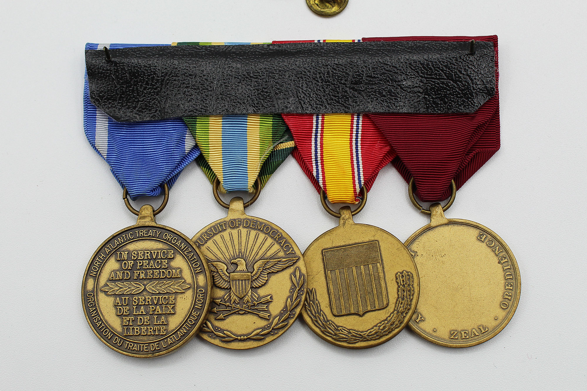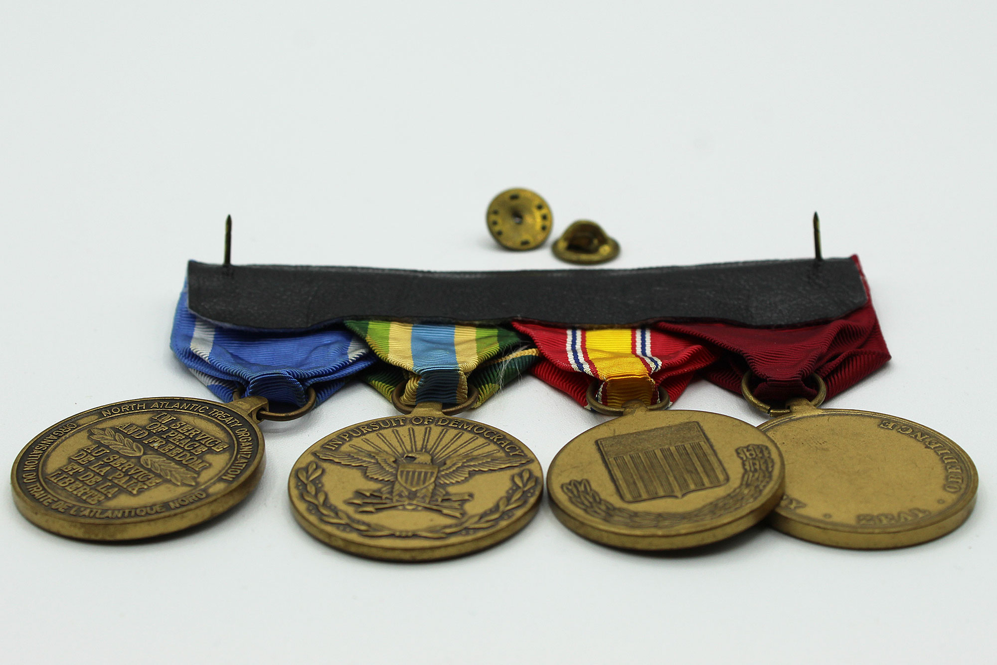United States Navy Four Place Medal Bar. Clutch back attachment. The medals include: Navy Good Conduct medal, National Defense Service medal, Armed Forces Service Medal, and North Atlantic Treaty Organization (NATO) Medal. Appears to range from 1960s-1990s era. Worn and used condition.