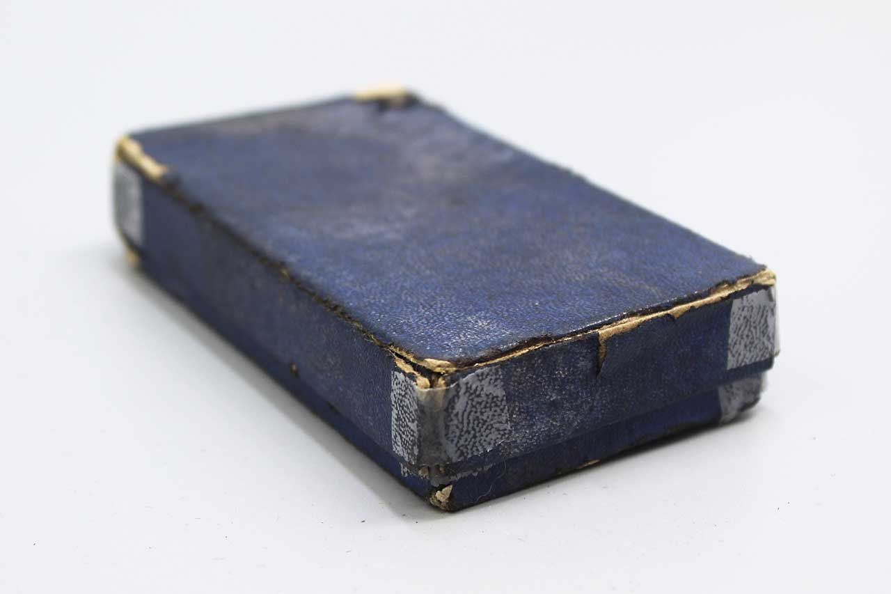United States WW2 American Defense Service Medal in Box. Stitched ribbon slot broach style pin system. Enameled lapel device also in box. Blue cardboard box in very rough condition. Worn condition.
