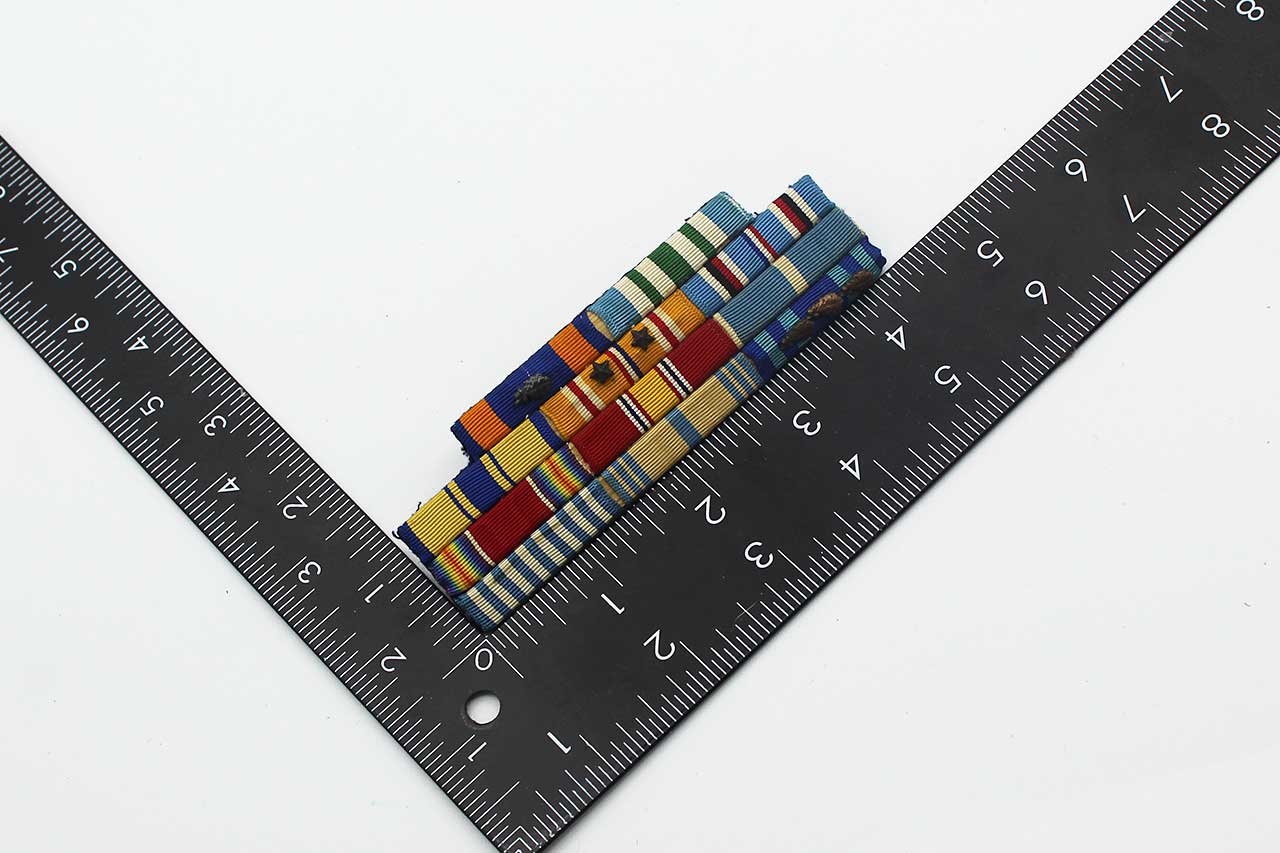 United States Eleven Place Ribbon Bar. Clutch back. Ribbons appear to be mostly from WW2 through Korea era campaigns with some from post 1950s era. Worn condition.