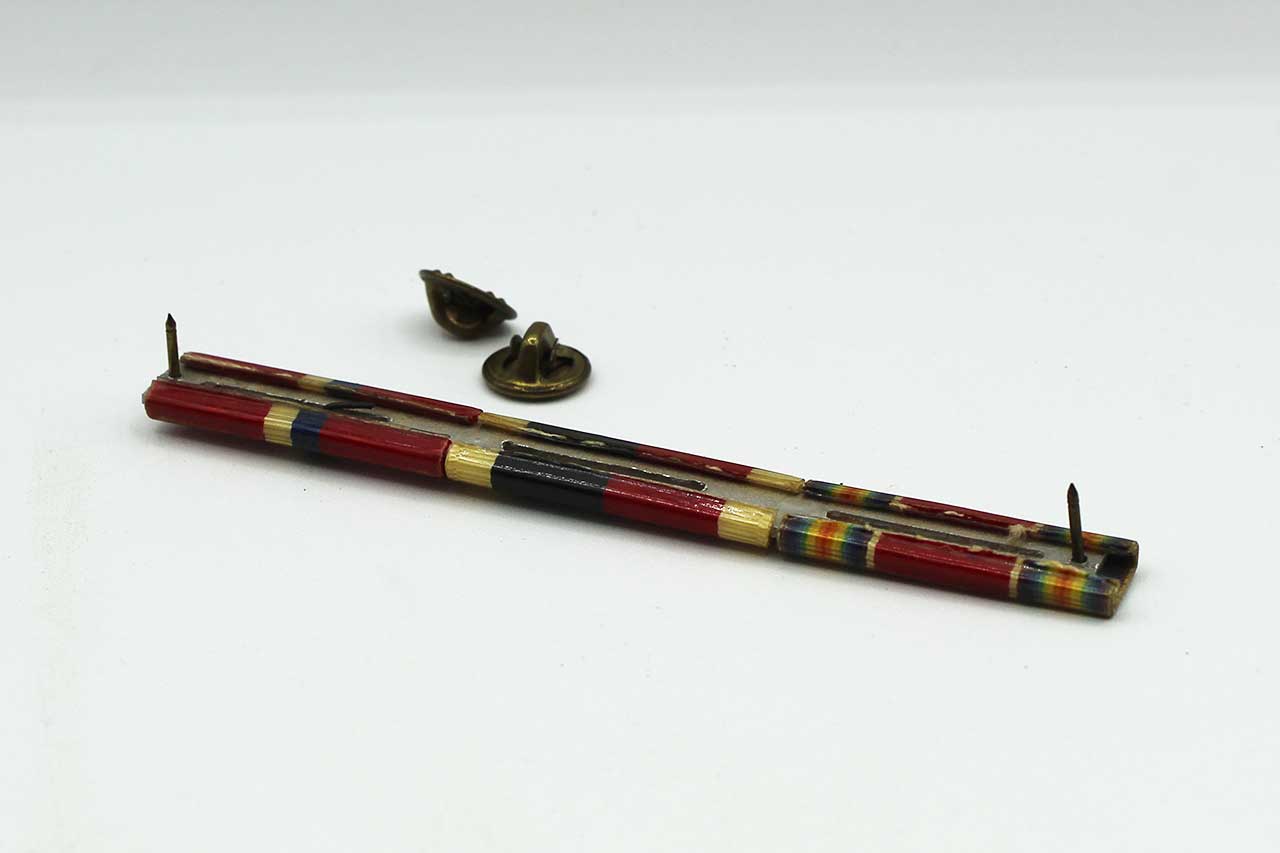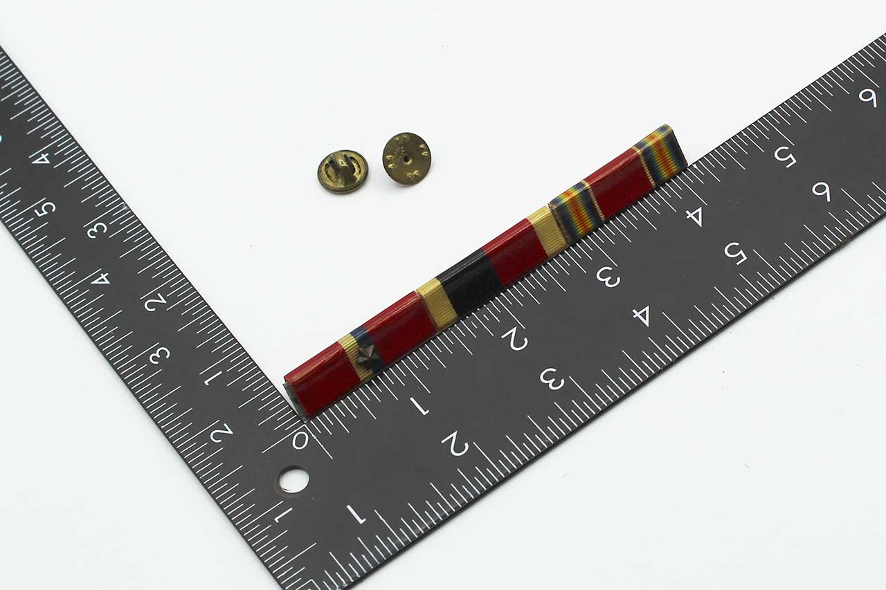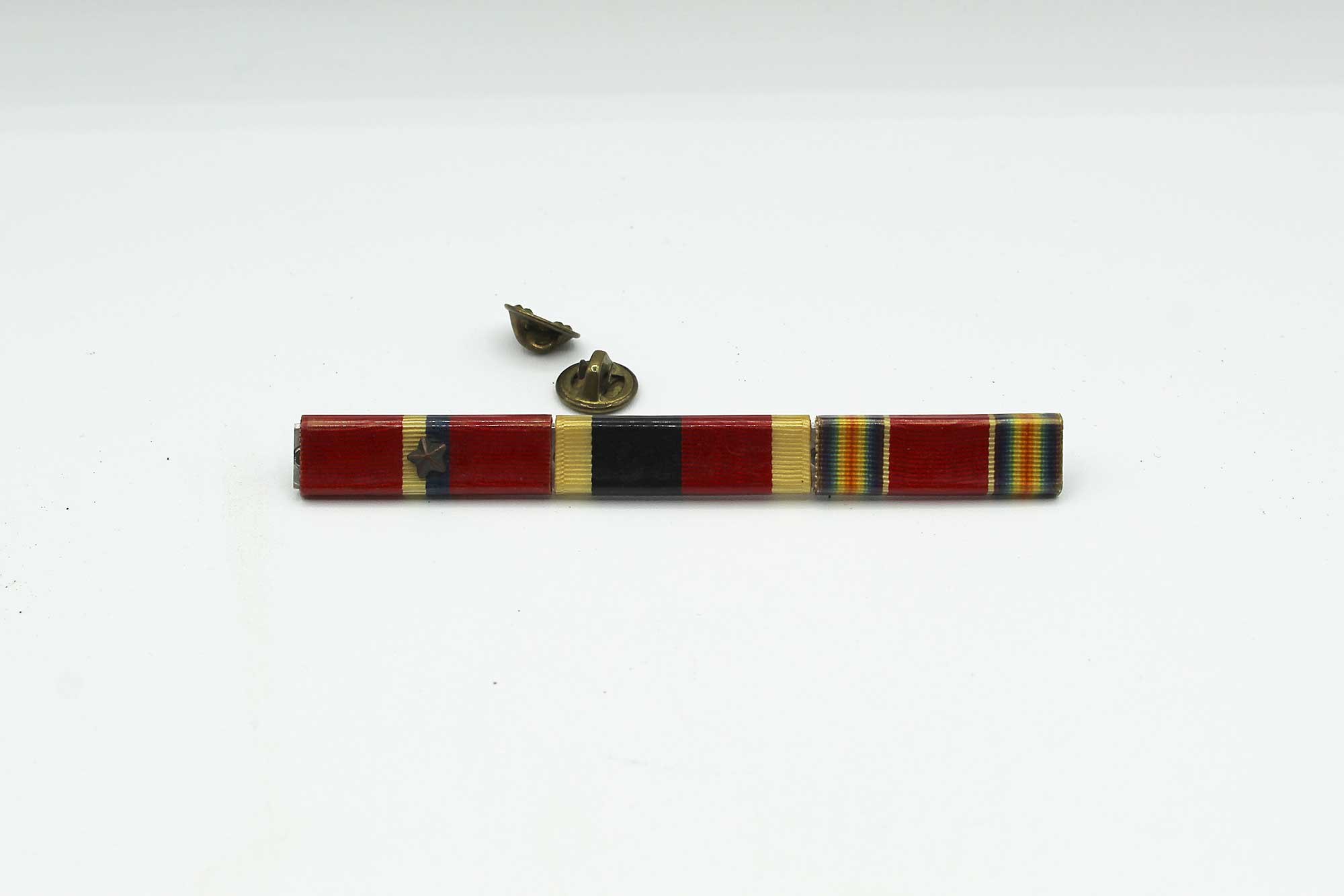 United States three Place Ribbon Bar. Clutch back. The three place ribbon bar includes: WW2 US Victory ribbon, US Occupation service ribbon, and Liberation of Philippines ribbon with 1 star device. 1940s era. Worn condition.