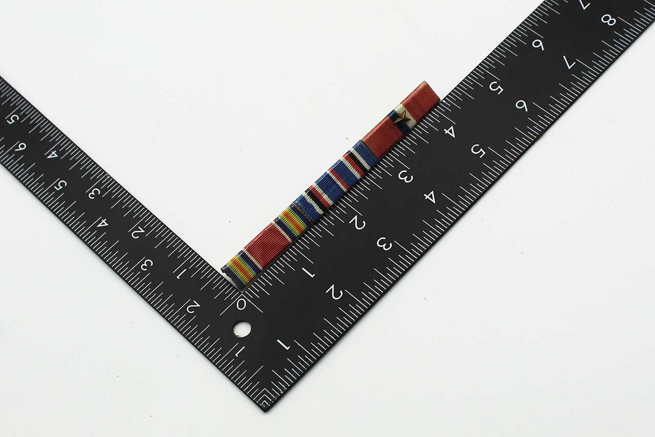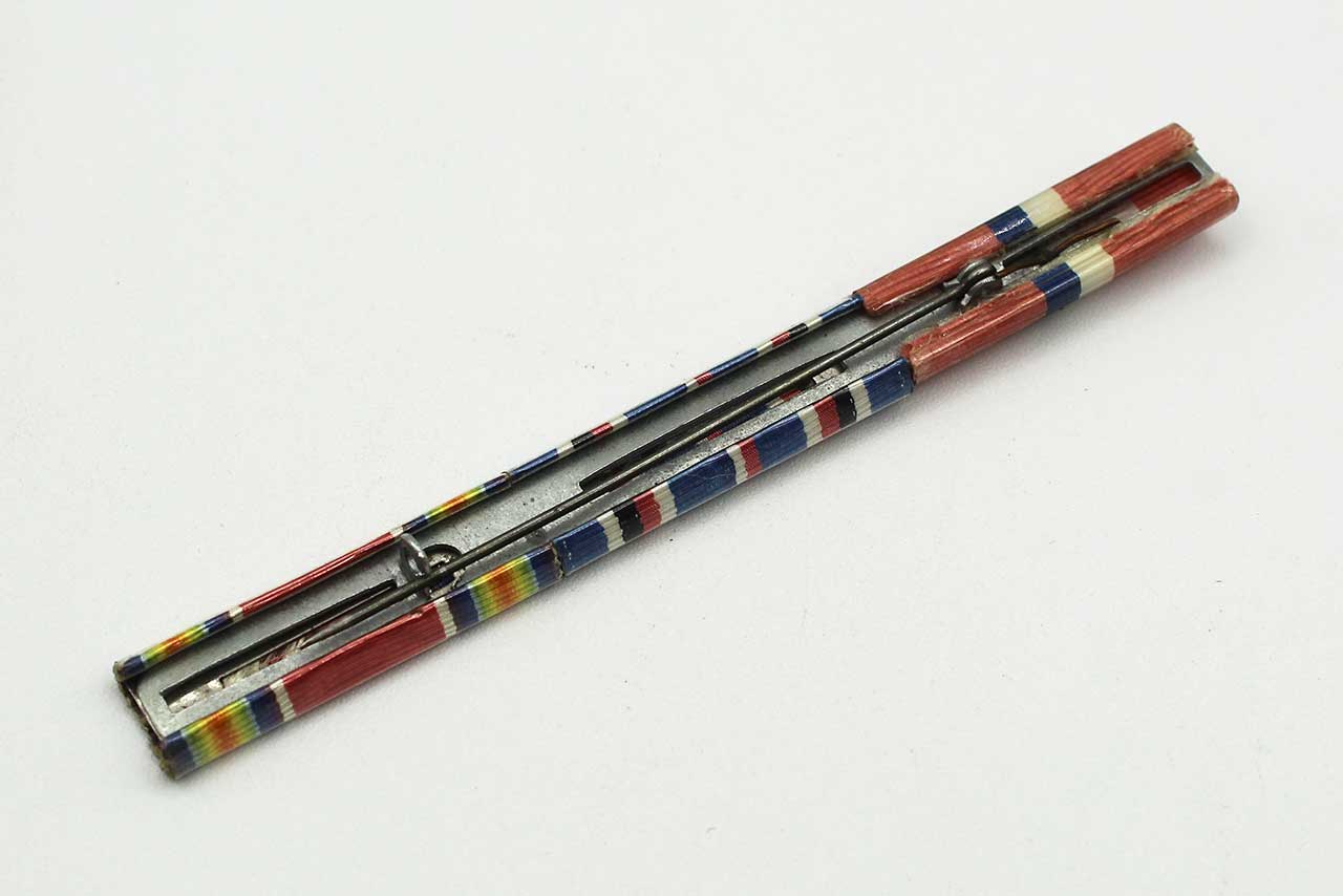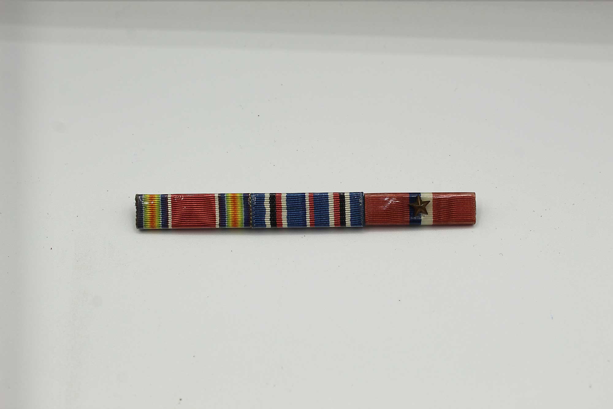 United States three Place Ribbon Bar. Pin back. The three place ribbon bar includes: WW2 US Victory ribbon, WW2 American Campaign ribbon, and Liberation of Philippines ribbon with 1 star device. 1940s era. Worn condition.