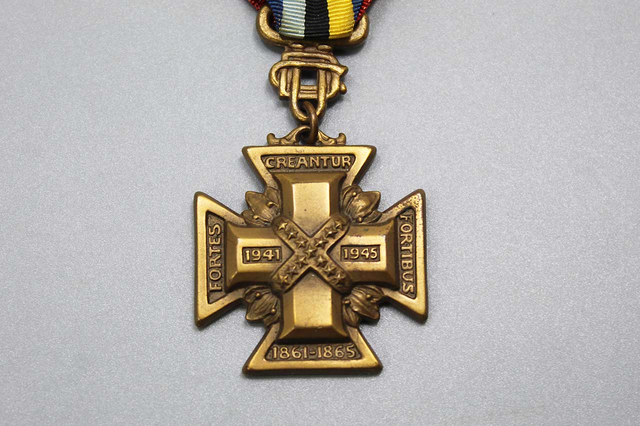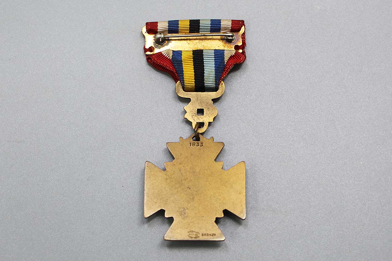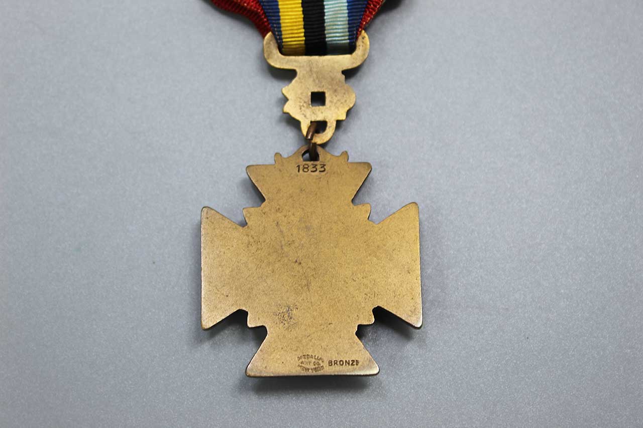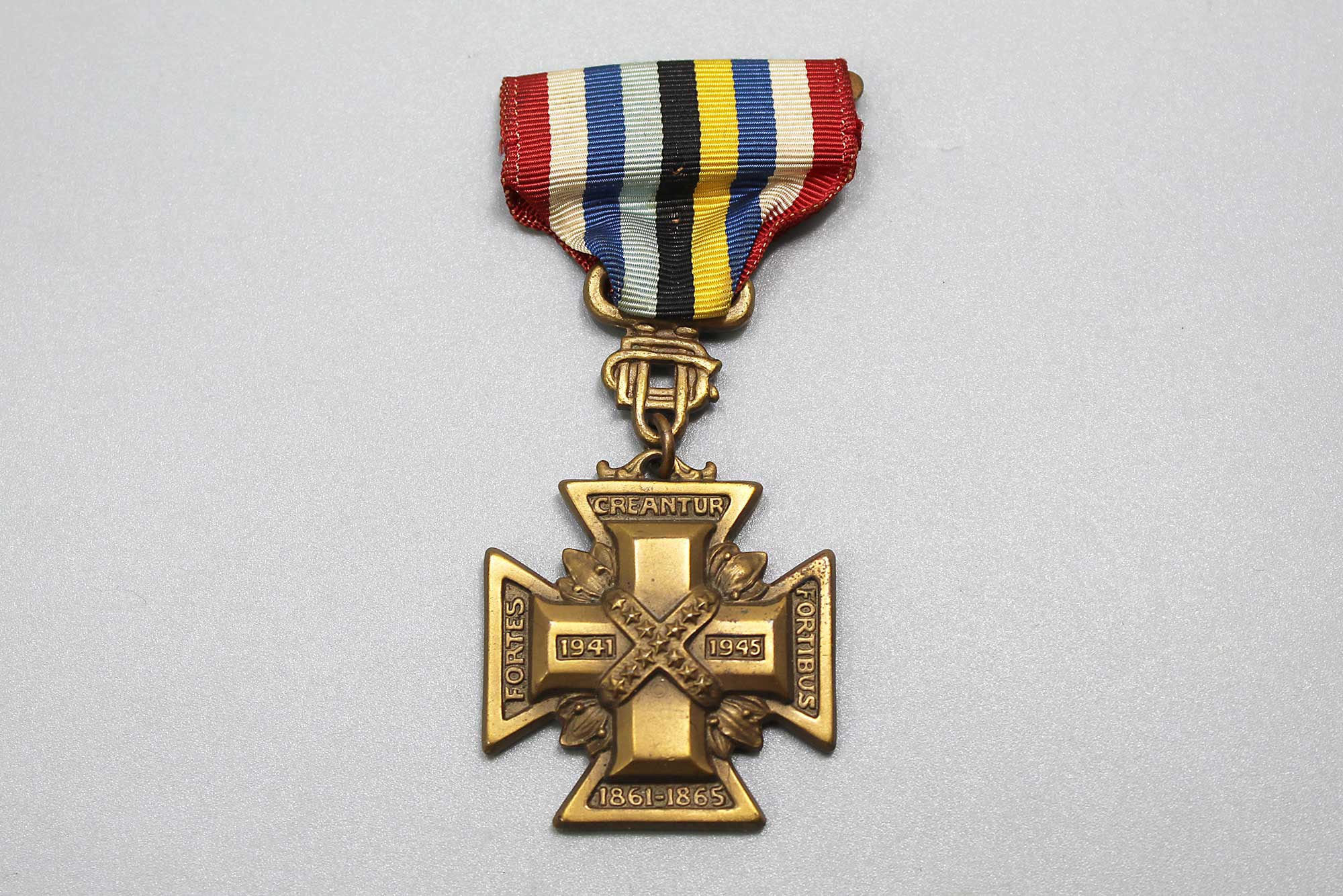 American UDC (United Daughters of the Confederacy) Military Service Cross 1941-1945 (WW2) version marker marked on the reverse with the earlier Medallic Art Co NY and Bronze marks. Presented to veterans of WW2 who were blood descendants of Confederate military personnel. Also, numbered on reverse with earlier issue relatively lower number of “1833”. Pin attachment system is the slot broach with stitched ribbon design. Worn condition.