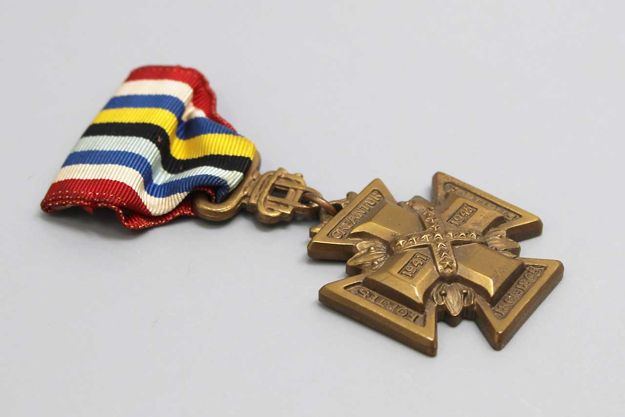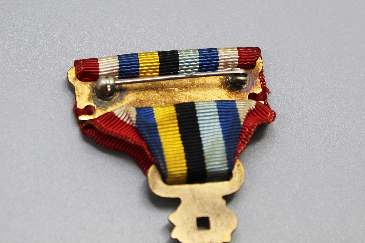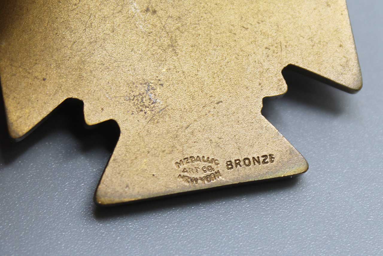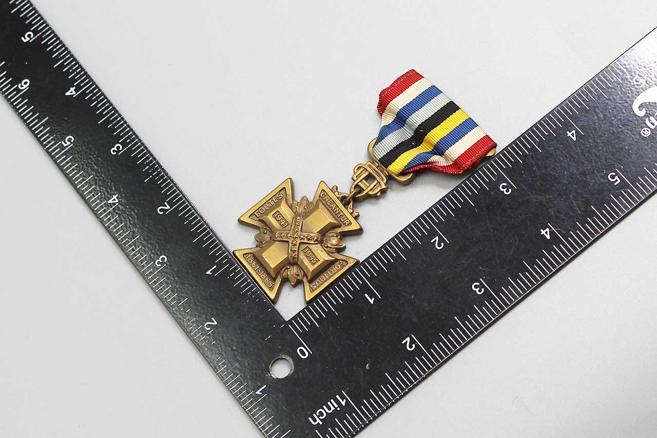 American UDC (United Daughters of the Confederacy) Military Service Cross 1941-1945 (WW2) version marker marked on the reverse with the earlier Medallic Art Co NY and Bronze marks. Presented to veterans of WW2 who were blood descendants of Confederate military personnel. Also, numbered on reverse with earlier issue relatively lower number of “1833”. Pin attachment system is the slot broach with stitched ribbon design. Worn condition.
