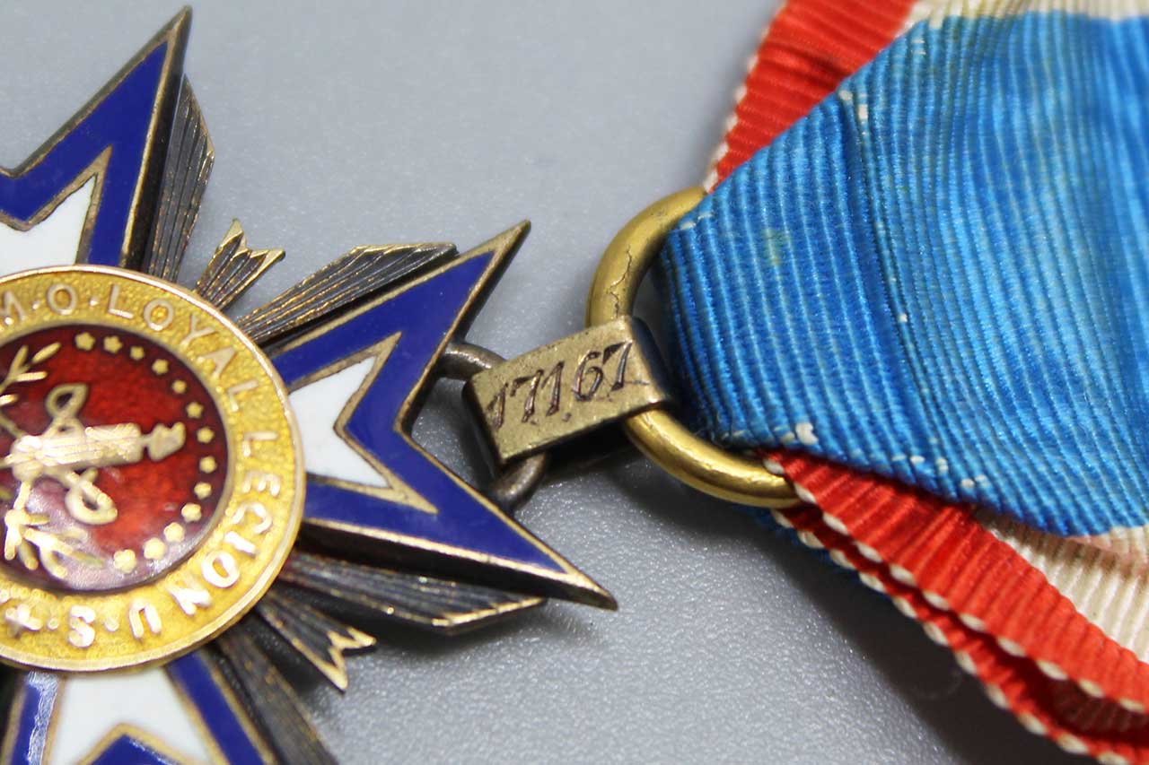 United States Mollus (Military Order of the Loyal Legion of the United States) membership medal, numbered “17167” on the suspension loop. Missing pin. Worn condition.
