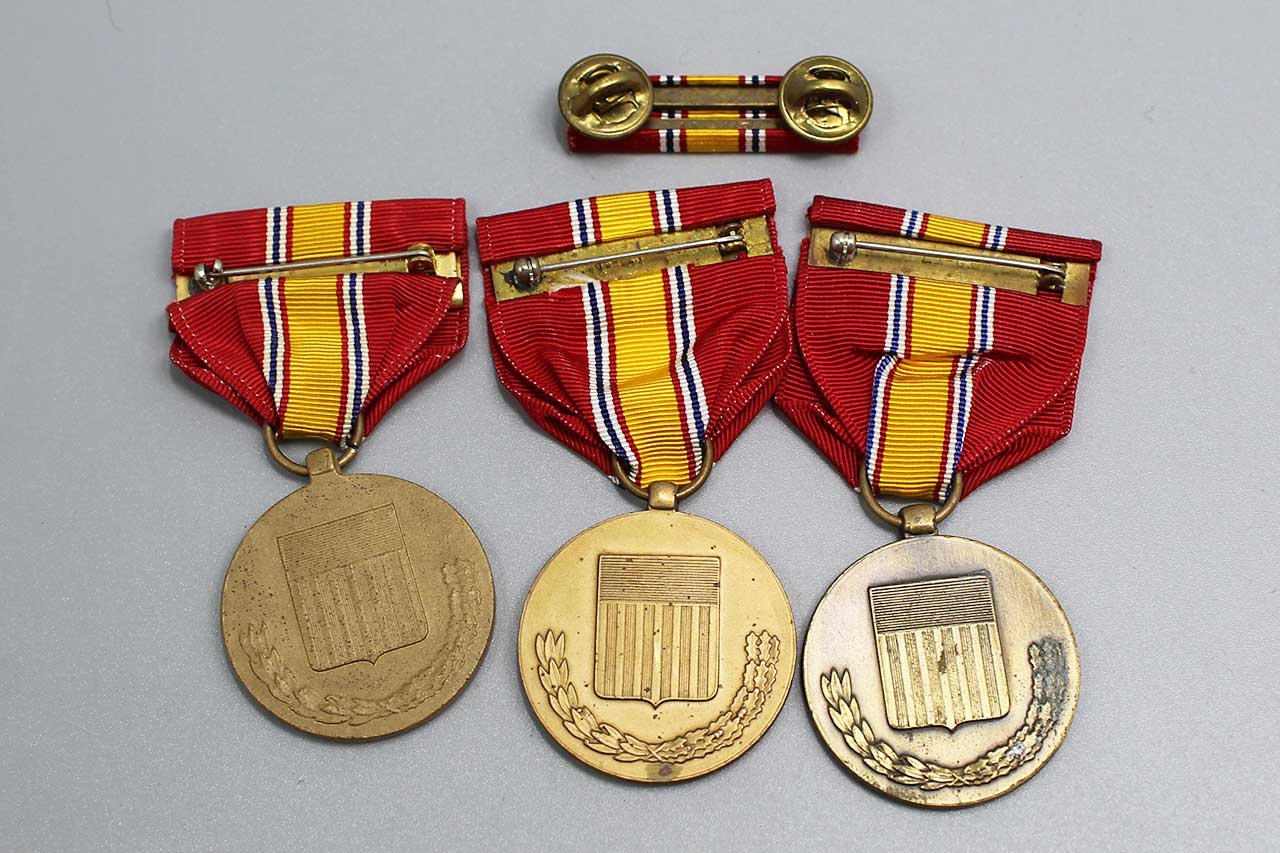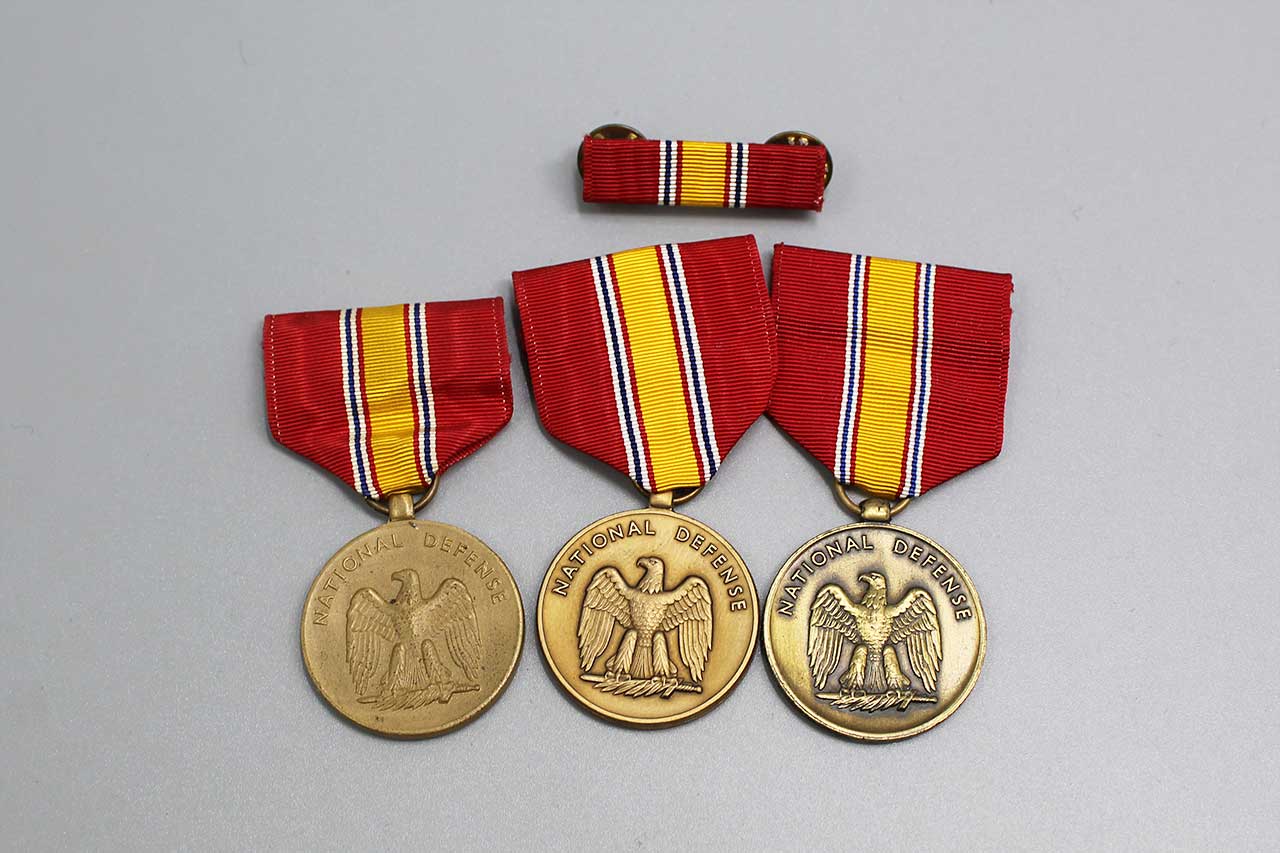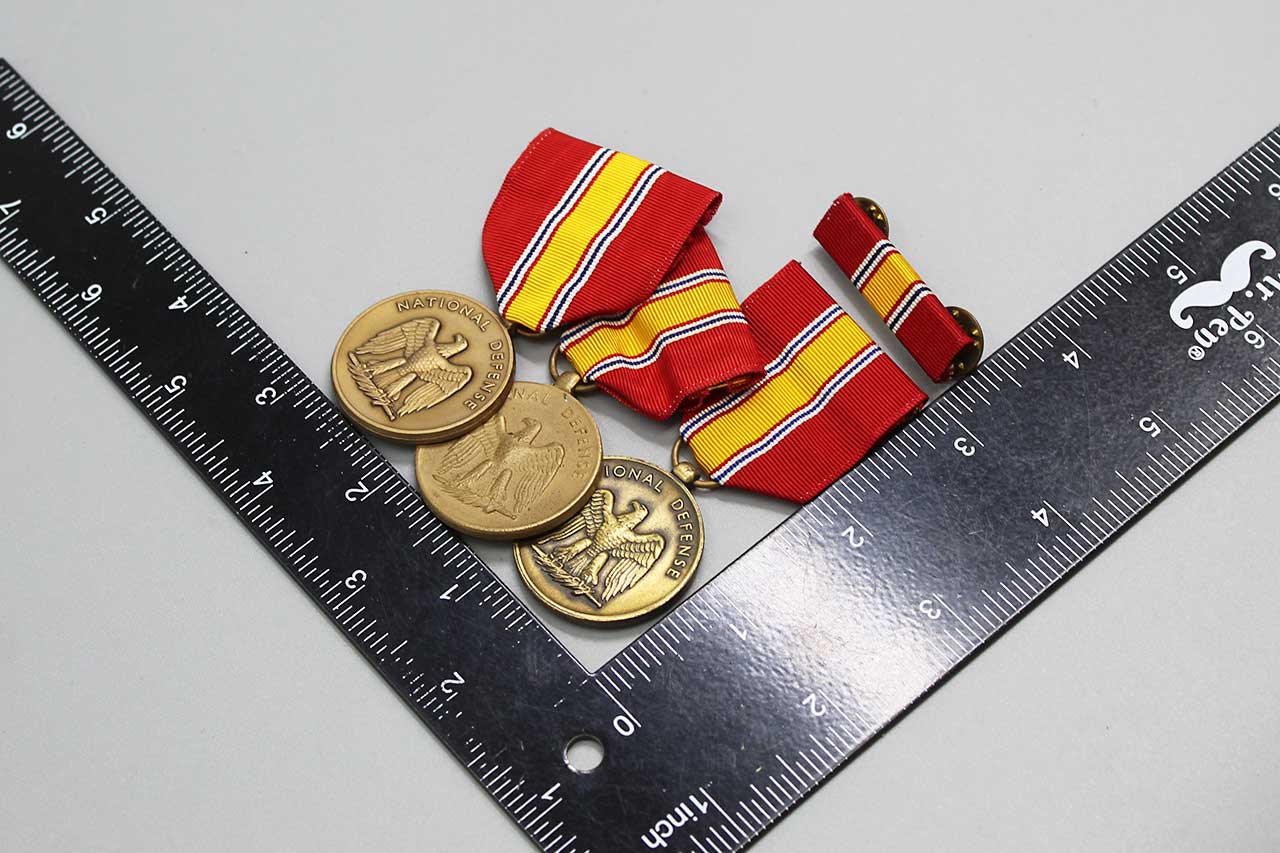 United States National Defense Service Medal Group of 3 medals, plus one clutch back ribbon bar. Medals have crimped brooch pin backs. I believe these are 1950s-1990s era. Worn condition.