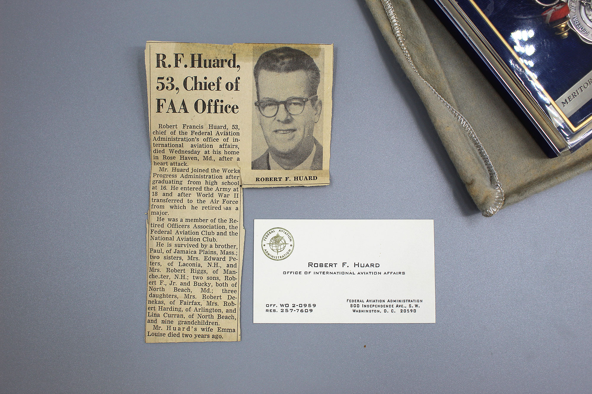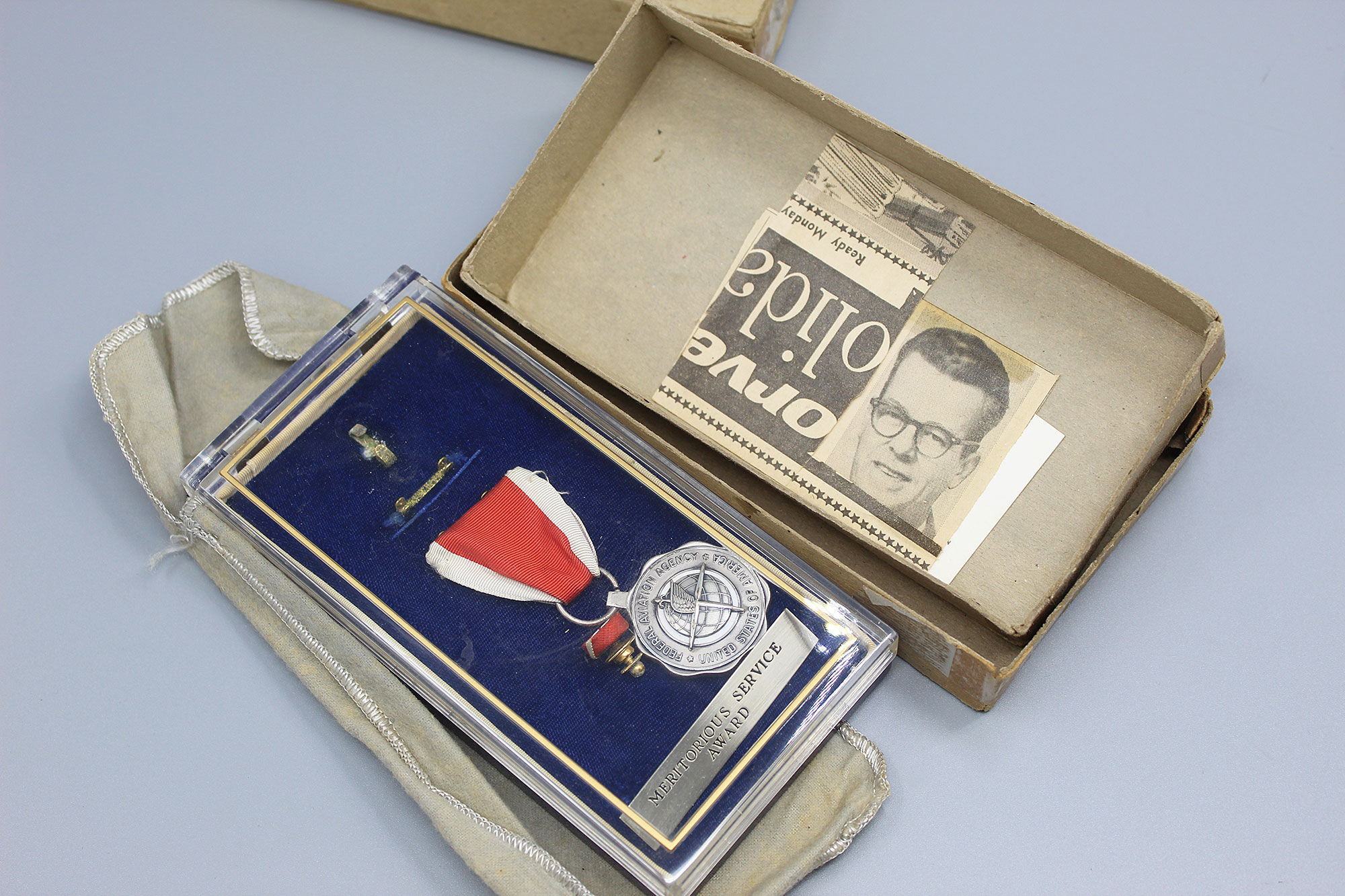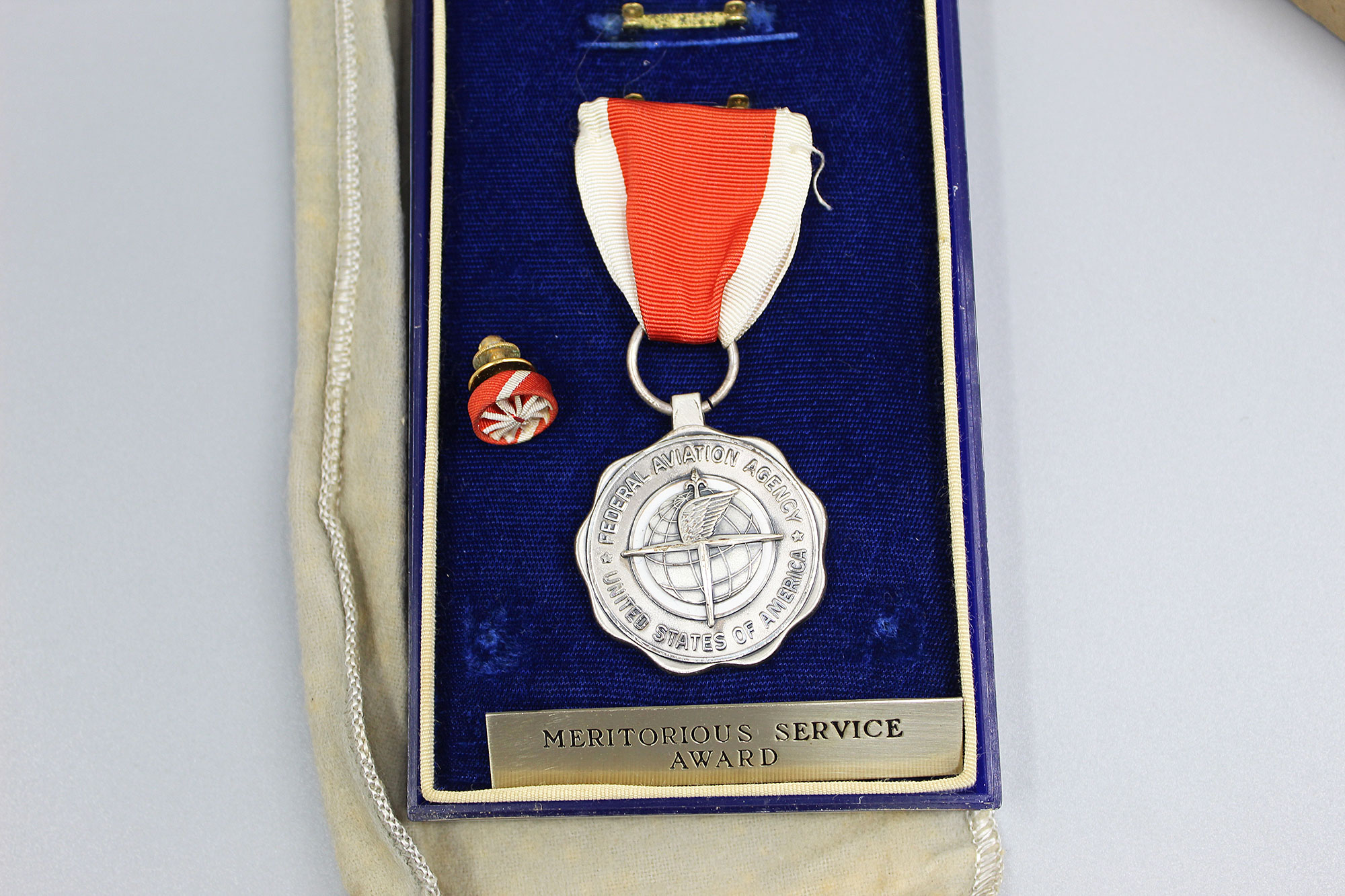 United States FAA (Federal Aviation Administration) Meritorious Service Award Set. The Army Commendation Medal is named on the back to Robert F. Huard (Chief of FAA Office). The FAA Meritorious Service Award is also named to Robert F. Huard and is marker marked LGB and Sterling marked. Set also has business card of Robert F. Huard who was the Chief of FAA Office. Both medals in 1960s type era clear plastic cases with cover bags and cardboard outer boxes.