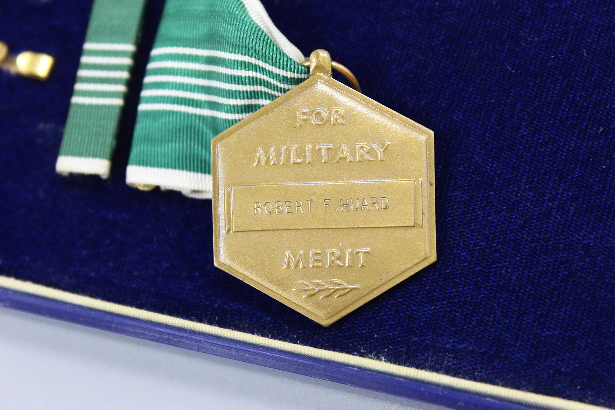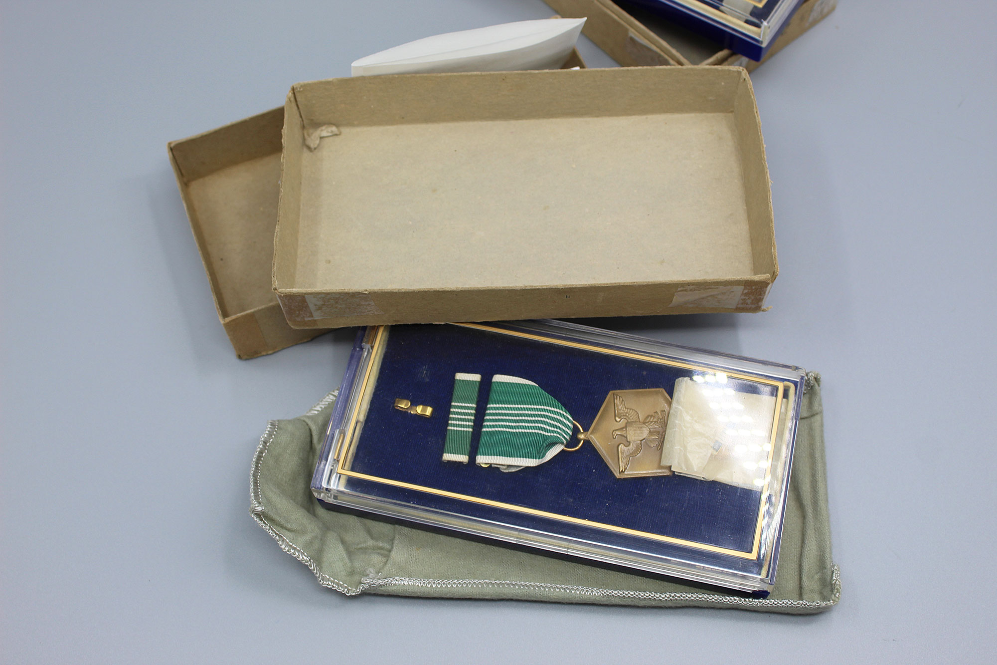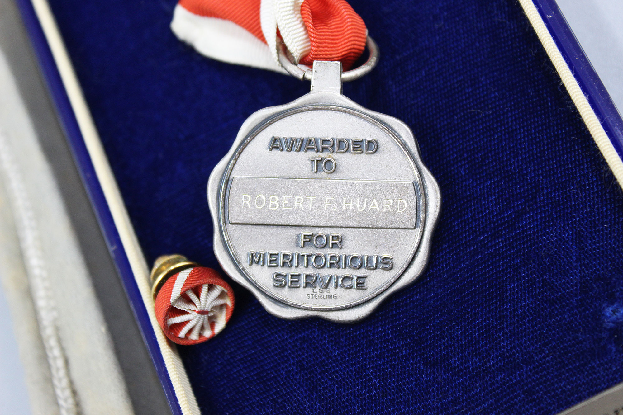 United States FAA (Federal Aviation Administration) Meritorious Service Award Set. The Army Commendation Medal is named on the back to Robert F. Huard (Chief of FAA Office). The FAA Meritorious Service Award is also named to Robert F. Huard and is marker marked LGB and Sterling marked. Set also has business card of Robert F. Huard who was the Chief of FAA Office. Both medals in 1960s type era clear plastic cases with cover bags and cardboard outer boxes.