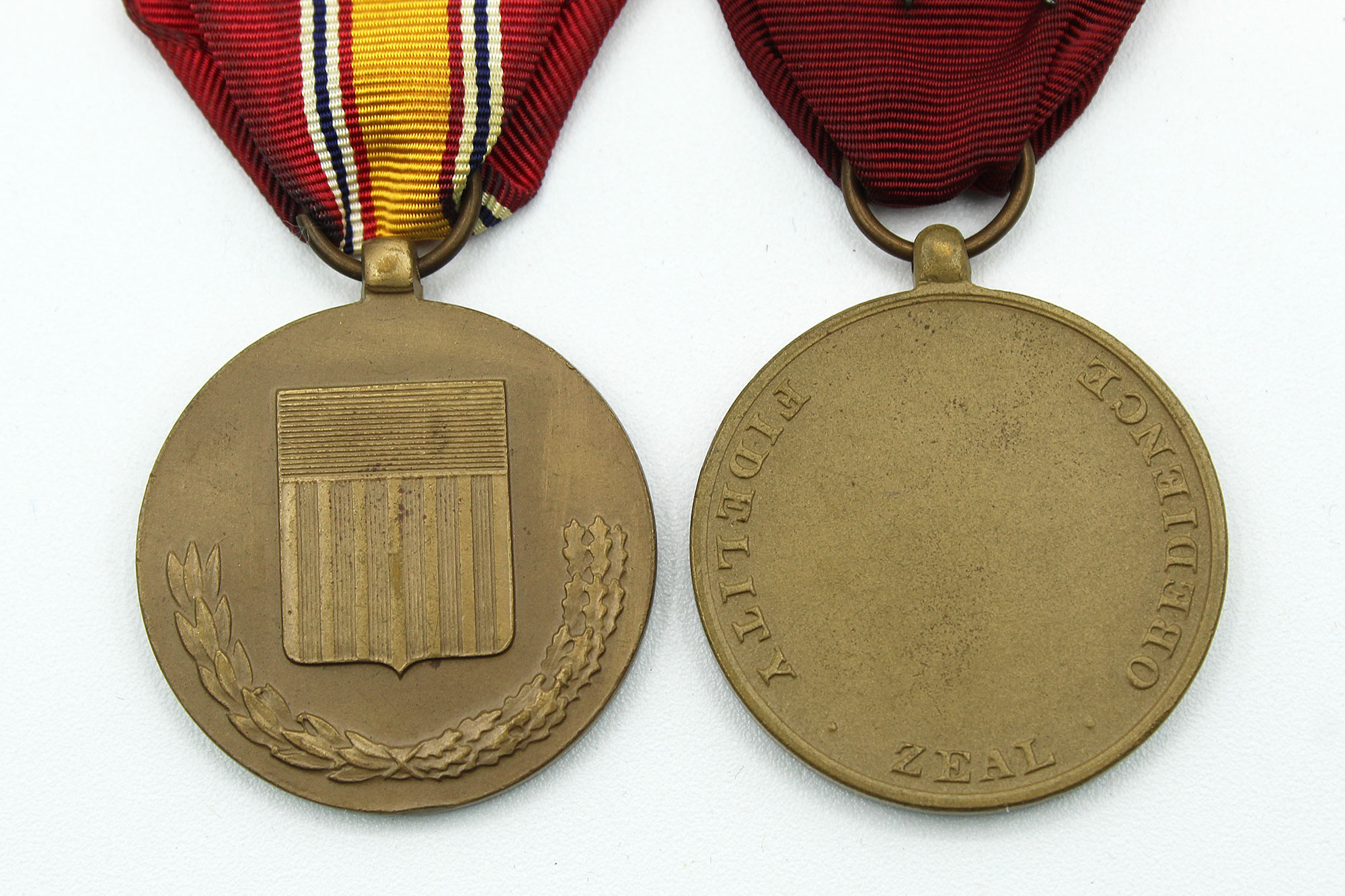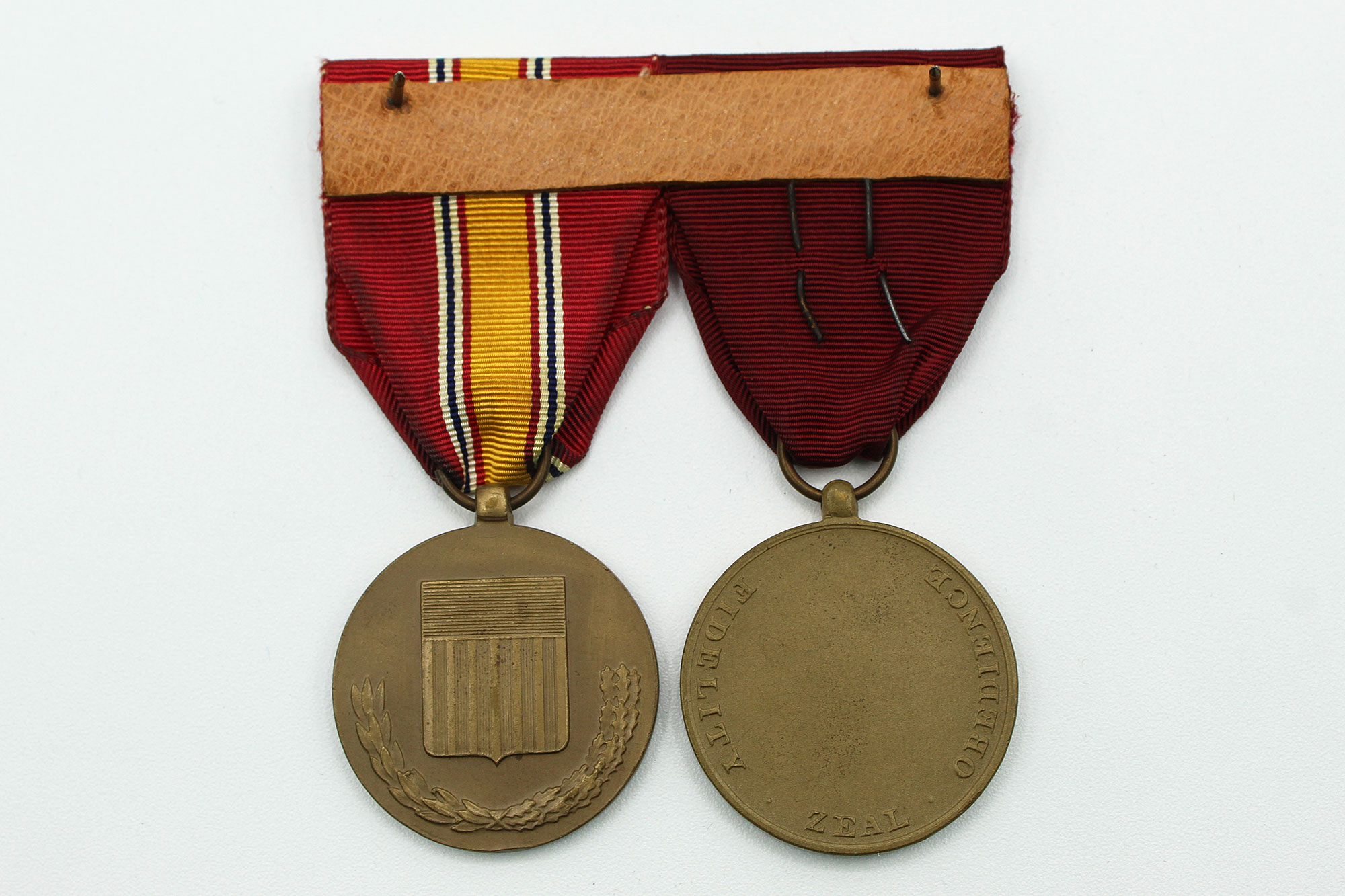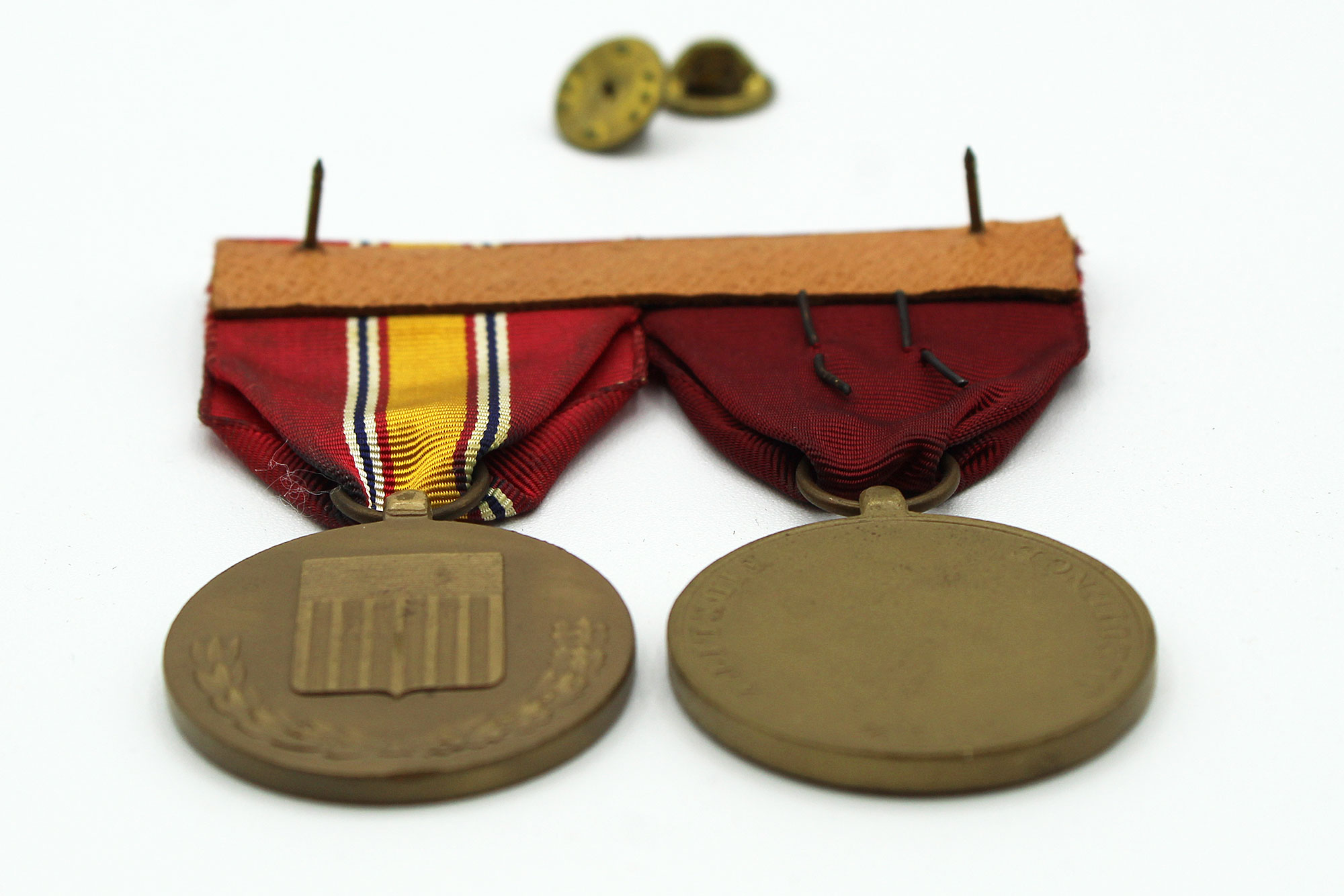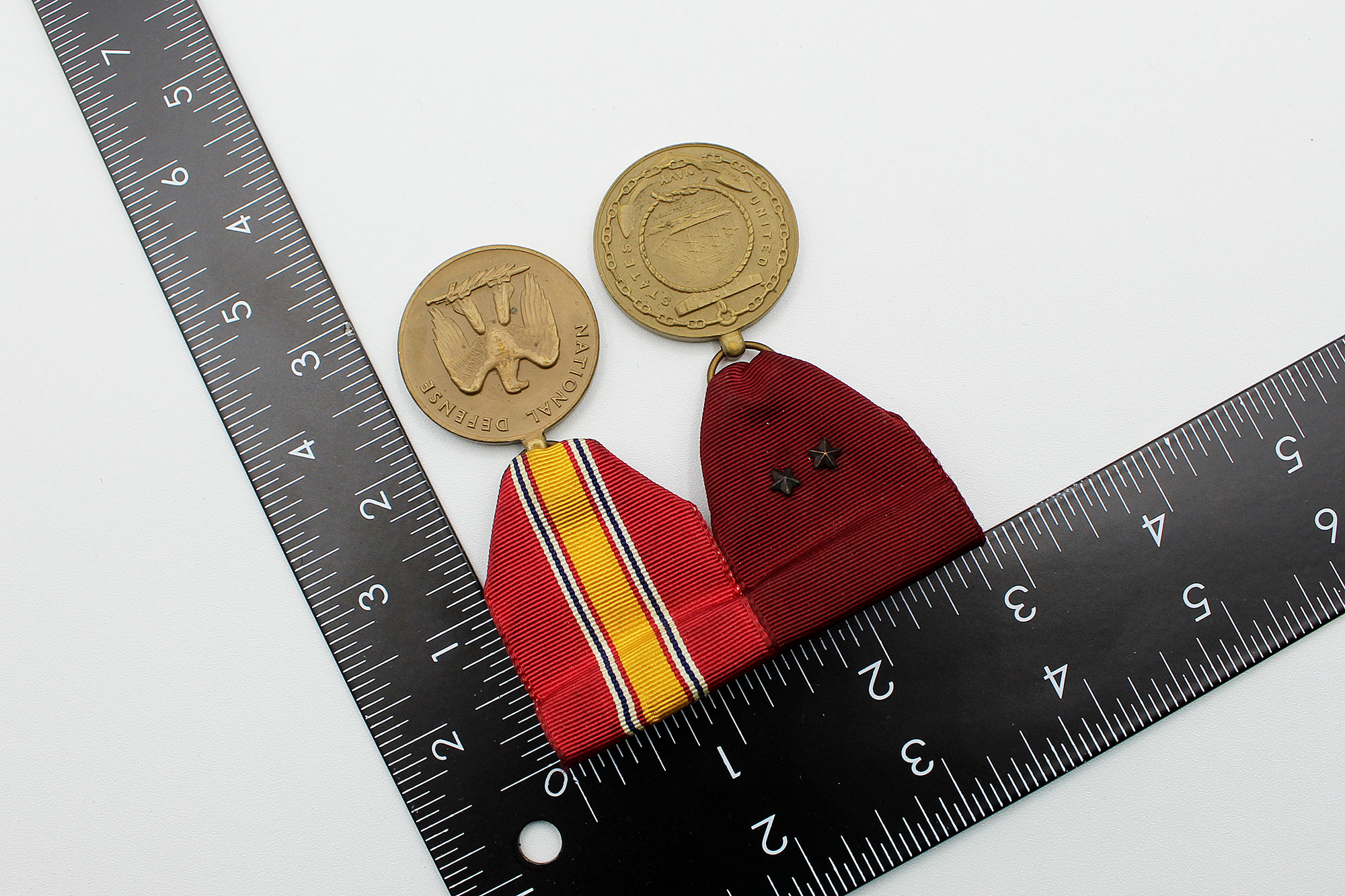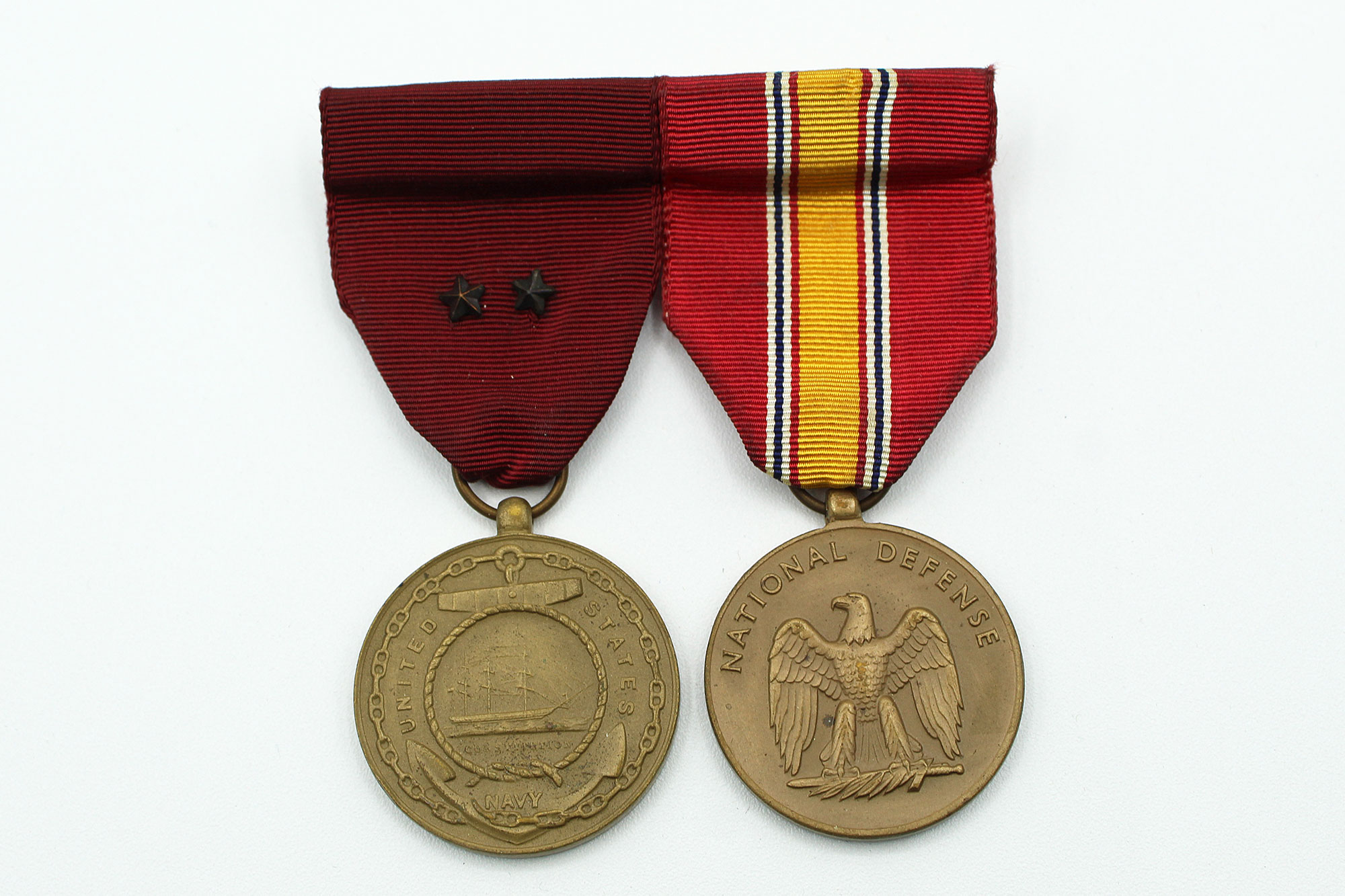 United States Navy Two Place Medal Bar. Clutch bar attachment. The medals include: Navy Good Conduct medal with stars, and National Defense service medal. Appears to range from 1950s-1970s era. Worn condition.
